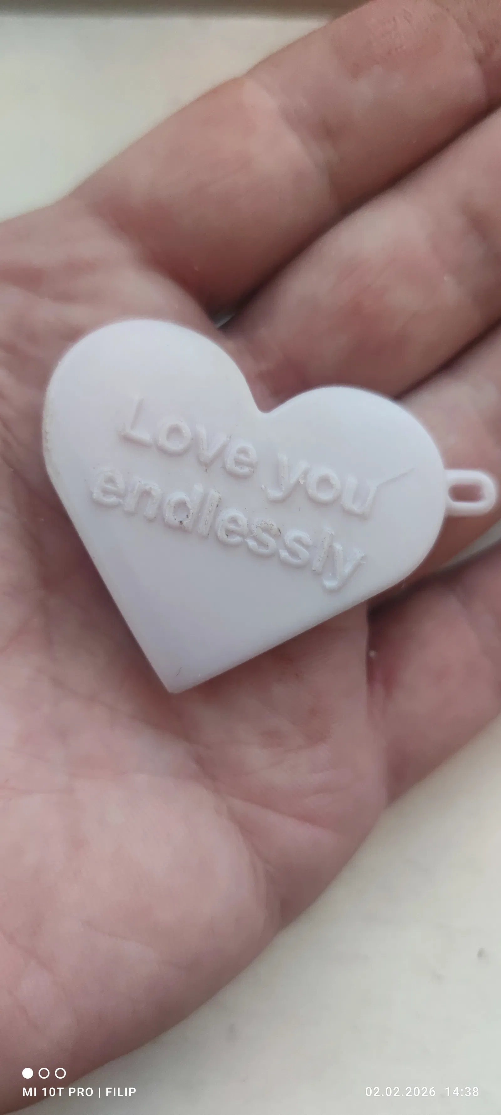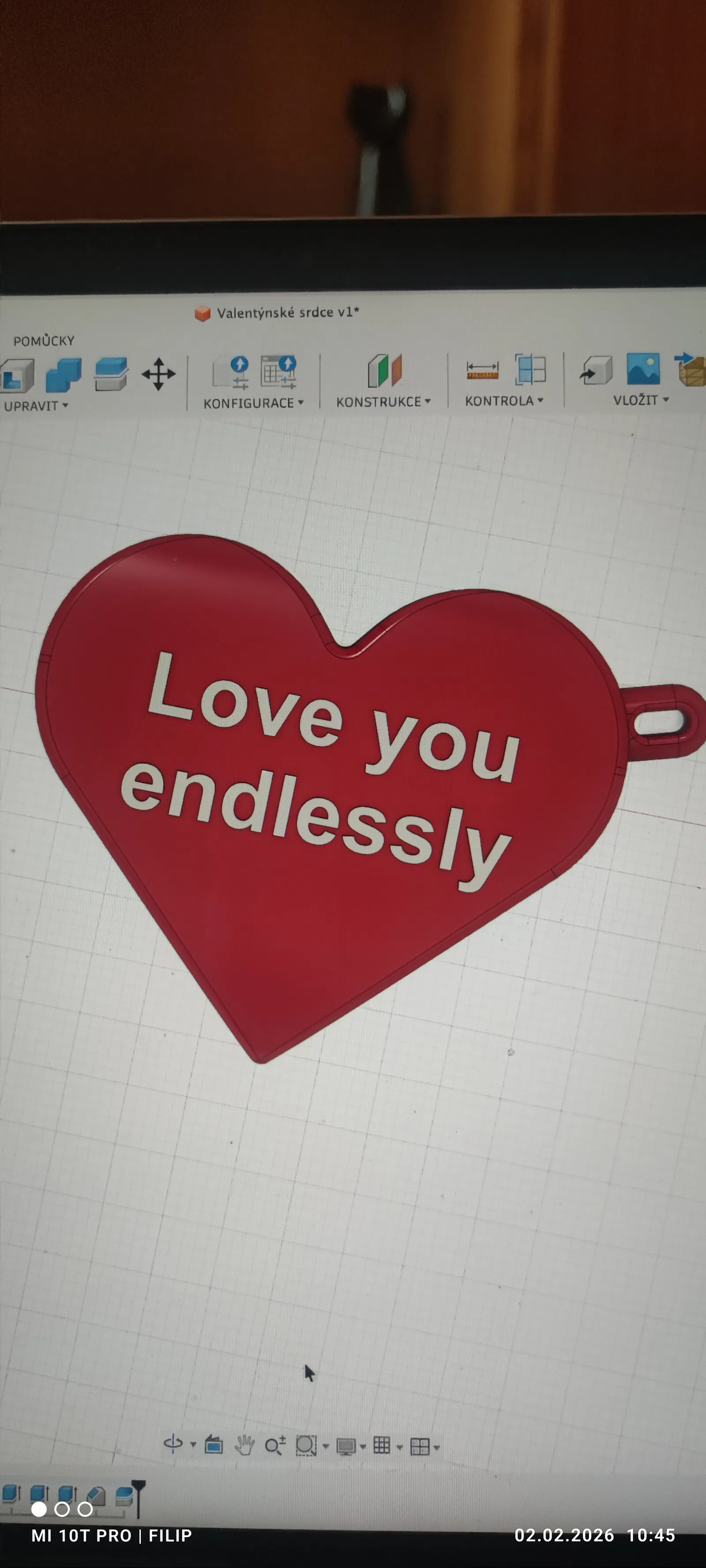 Mẫu “Valentine’s Heart” được tạo trong Fusion 360, in không cần supports, phù hợp làm móc khóa. Thiết lập gợi ý: layer 0.1 mm, infill 10%, PLA; đã in thử ổn trên Prusa Core One.