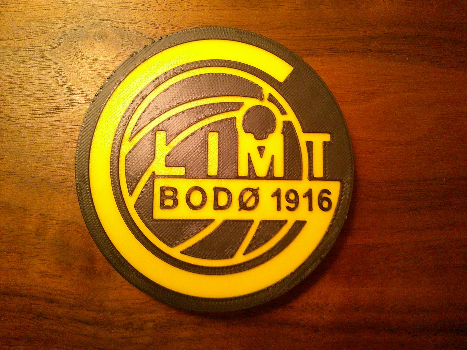 Mẫu lót ly hoặc bảng treo logo FK Bodø/Glimt. Hướng dẫn in: in màu vàng tới cao 6.8mm, sau đó chuyển sang màu đen để hoàn thiện phần còn lại.