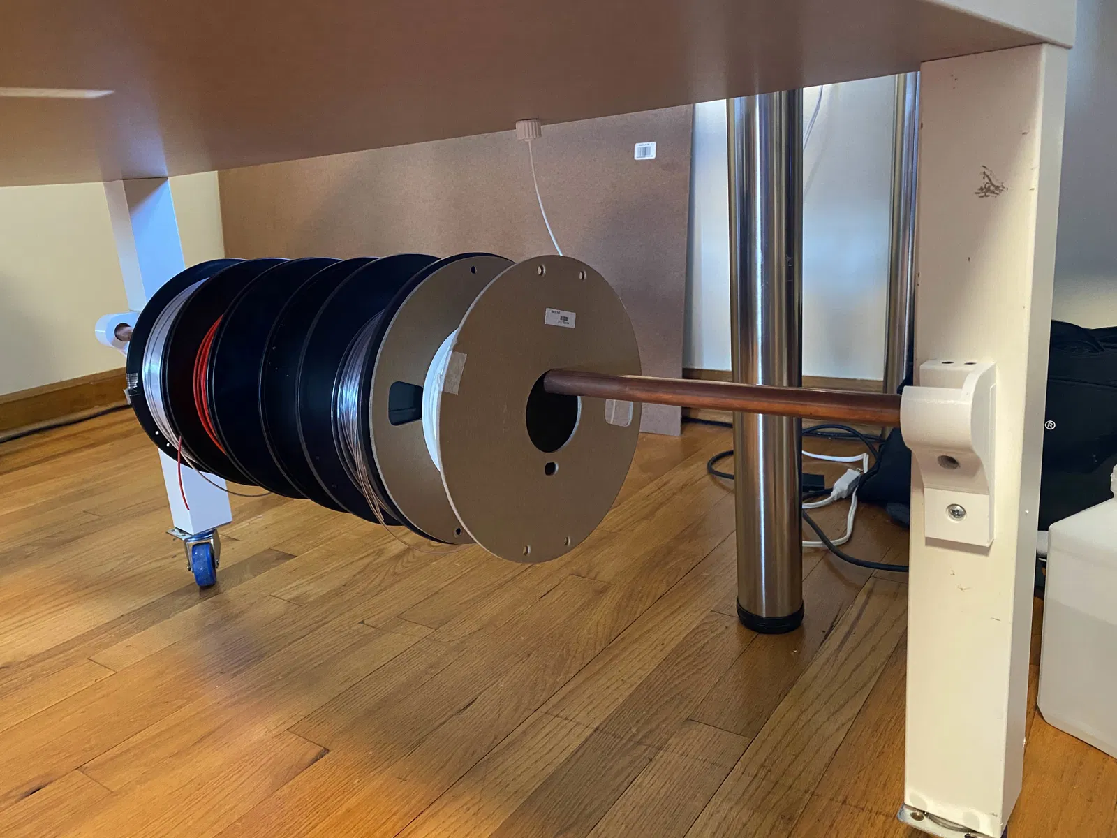Giải pháp tối giản để treo nhiều cuộn filament bên dưới bàn cà phê LACK. Bracket dùng lại lỗ vít sẵn có, chỉ cần khoan thêm 2 lỗ. Dùng bu lông M3 self-tap và thanh rod (ví dụ ống đồng OD 16mm).
