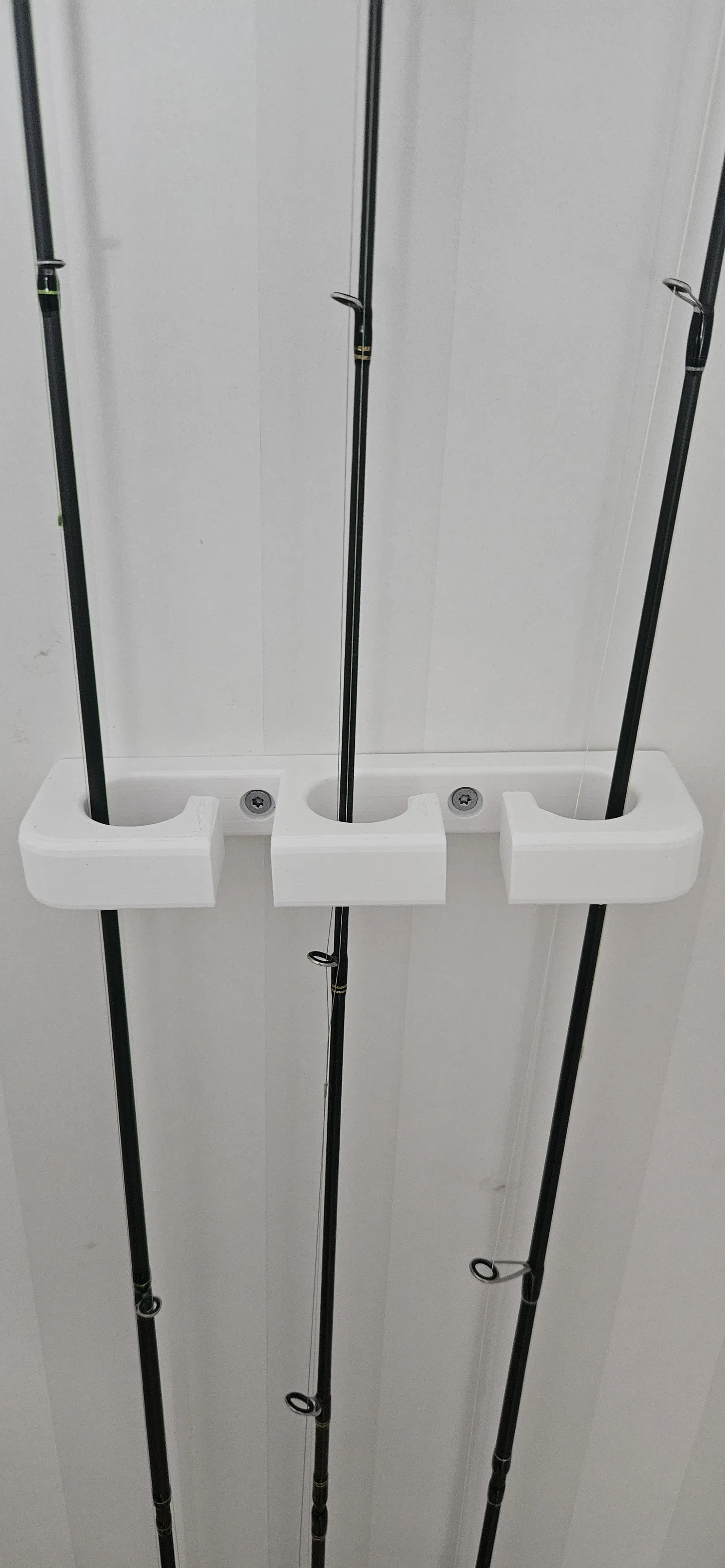 Giá treo tường cho cần câu. Chừa khoảng cách tâm-tâm (cc) 70mm cho mỗi cây cần là đủ để chúng không bị vướng, rối vào nhau. Nếu cần dùng nhiều hơn một giá treo thì khoảng cách cc tới bộ 3 cây kế tiếp cũng vẫn là 70mm.