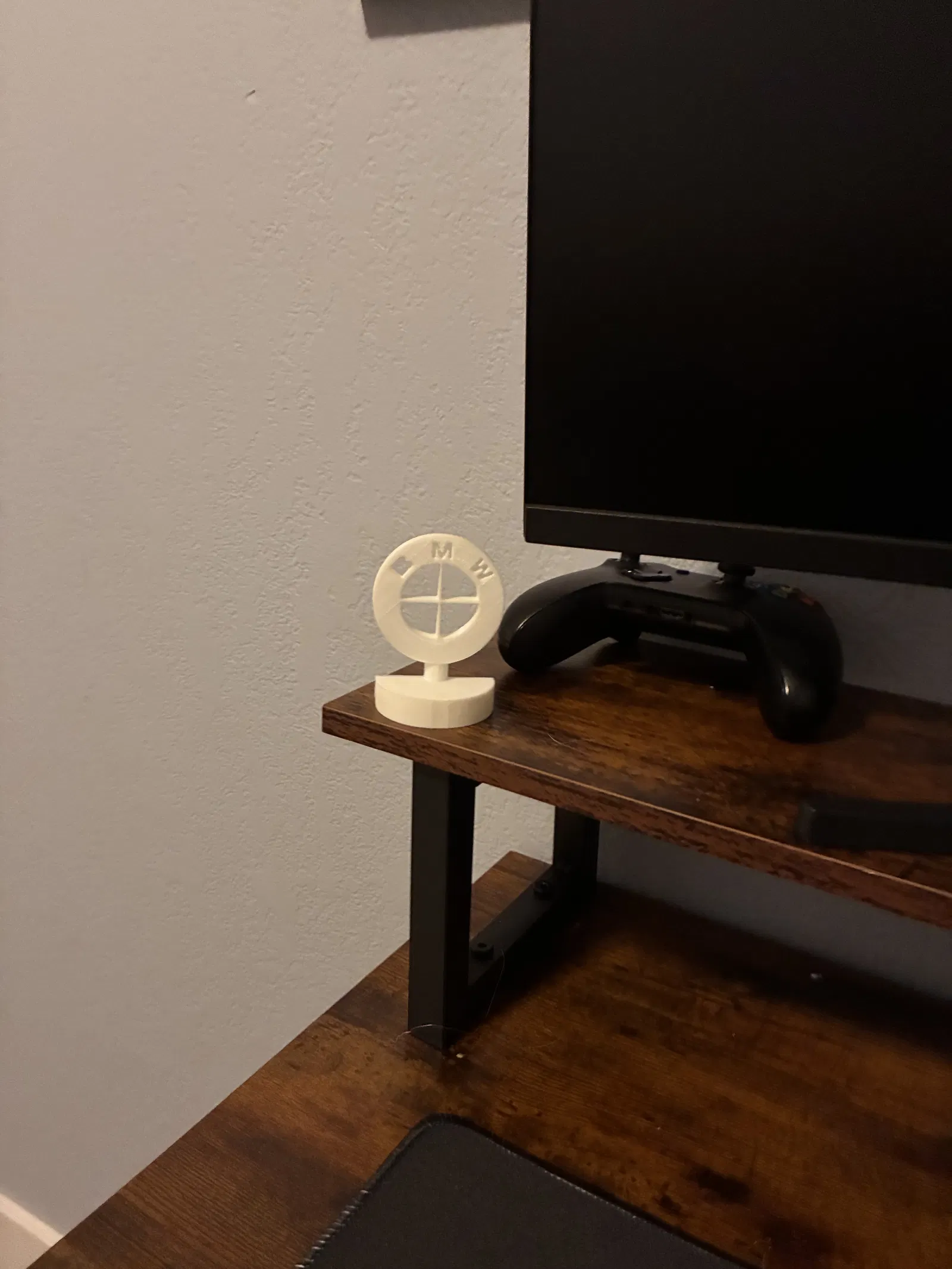 Mẫu decor để bàn lấy cảm hứng BMW, tối giản và gọn đẹp. Nên scale xuống 50–70% trước khi in để tiết kiệm filament và rút ngắn thời gian. In phẳng không cần supports, hợp PLA/PETG, lên đẹp với silk/metallic.