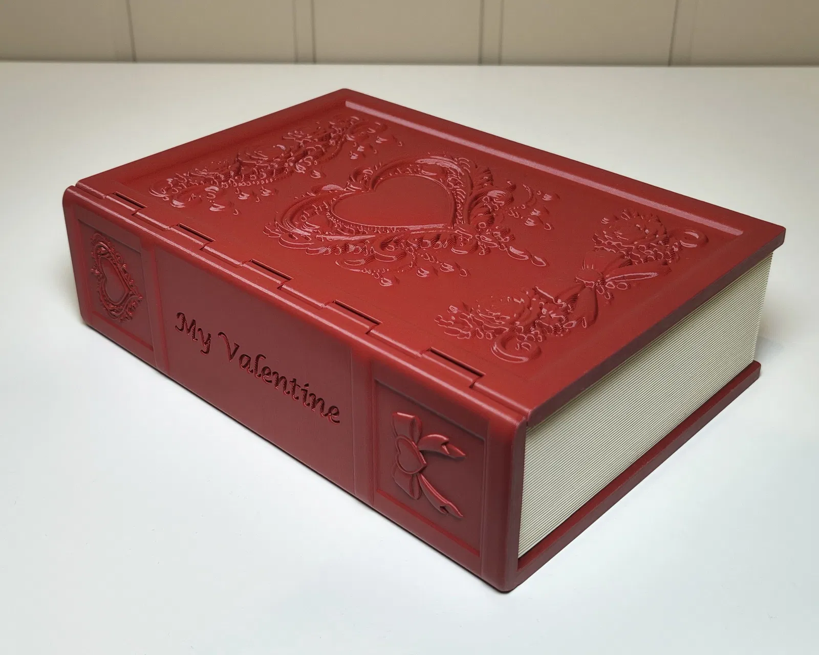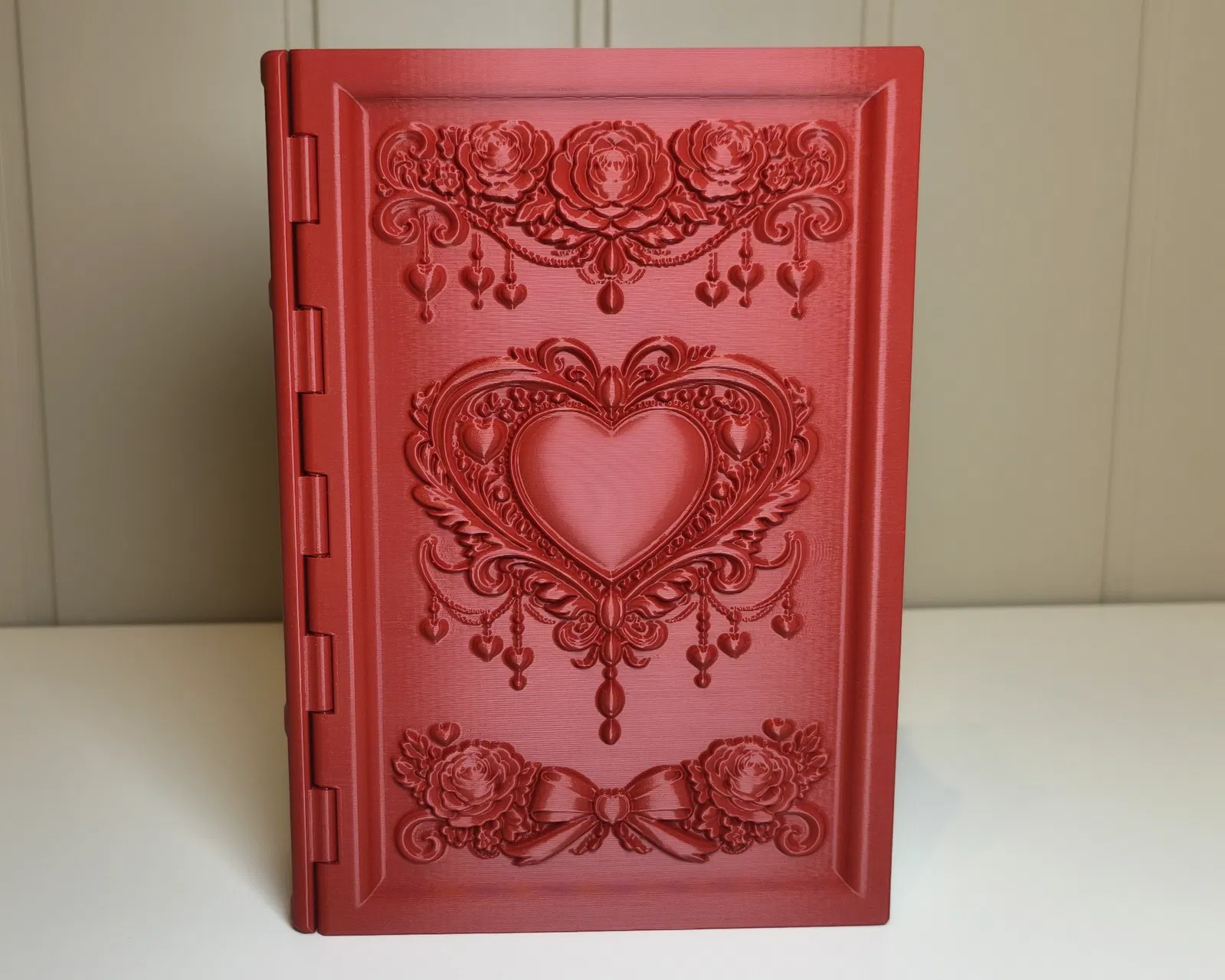 Hộp lưu trữ trang trí hình cuốn sách dập nổi chủ đề Valentine, có họa tiết trái tim và hoa hồng tinh xảo, ngăn chứa bí mật bên trong. In dễ với PLA, không cần supports, bản lề print-in-place và nắp nam châm.