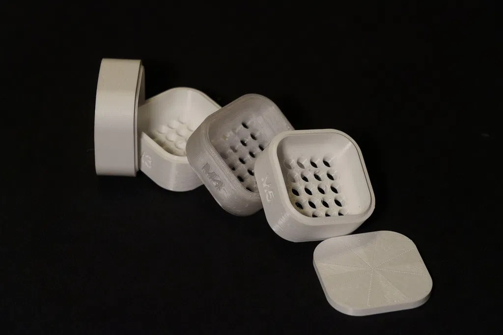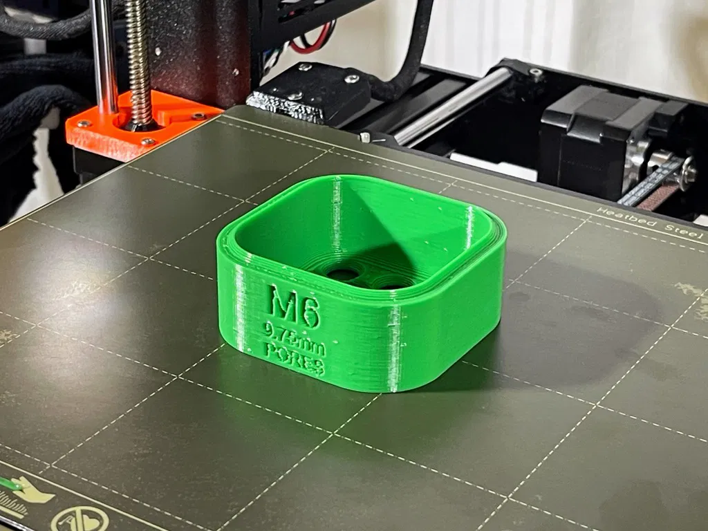 Một cái “screen” dành cho bu lông M6 đầu tròn (button head) và đầu lục giác chìm (socket head) cho bộ bolt sorter nhỏ của mình. Mỗi screen in tầm khoảng 1 tiếng theo setting của mình, không cần supports, brims, v.v. Mình in bằng PETG, layer 0.48 với nozzle 0.6. Nếu lúc đó có sẵn PLA thì chắc mình sẽ chọn PLA. Mình nghĩ độ cứng của PLA (và độ chính xác kích thước có vẻ tốt hơn một chút, ít nhất là với máy/setting của mình) sẽ có lợi cho độ bền lâu dài khi bu lông va đập vào bên trong. Nhưng dù vậy thì mình cũng đã lắc qua khá nhiều fasteners trên mấy screen PETG khác rồi, và tới giờ chúng vẫn ổn, chưa thấy xuống cấp gì nhiều.
