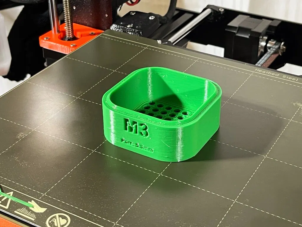 Một tấm “screen” dành cho ốc/vít M3 đầu tròn (button head) và đầu lục giác chìm (socket head). Mỗi screen in khoảng 1 tiếng theo thiết lập của mình, không cần supports, brims… Mình in bằng PETG, layer 0.48 với nozzle 0.6.