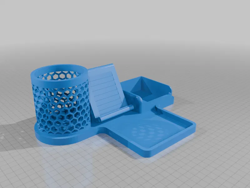 Mẫu organizer để bàn all-in-one nhỏ gọn, hiện đại: khay bút/bút chì, ngăn giấy note cỡ Post-it, khay sổ ghi chú và kệ đỡ điện thoại tích hợp. Tối ưu in 3D, bo góc đẹp, in PLA dễ, không cần supports.