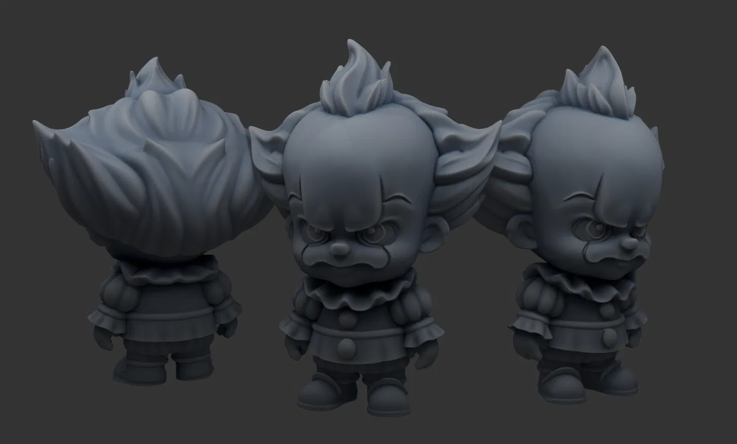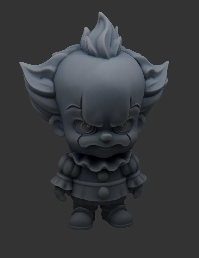 Tượng chibi Pennywise (IT) phong cách vừa creepy vừa dễ thương, tối ưu cho in 3D. Không có chi tiết mỏng dễ gãy, hợp cho FDM lẫn resin. Gợi ý FDM: layer 0.16–0.2 mm, nozzle 0.4 mm, infill 10–15%, không cần supports.