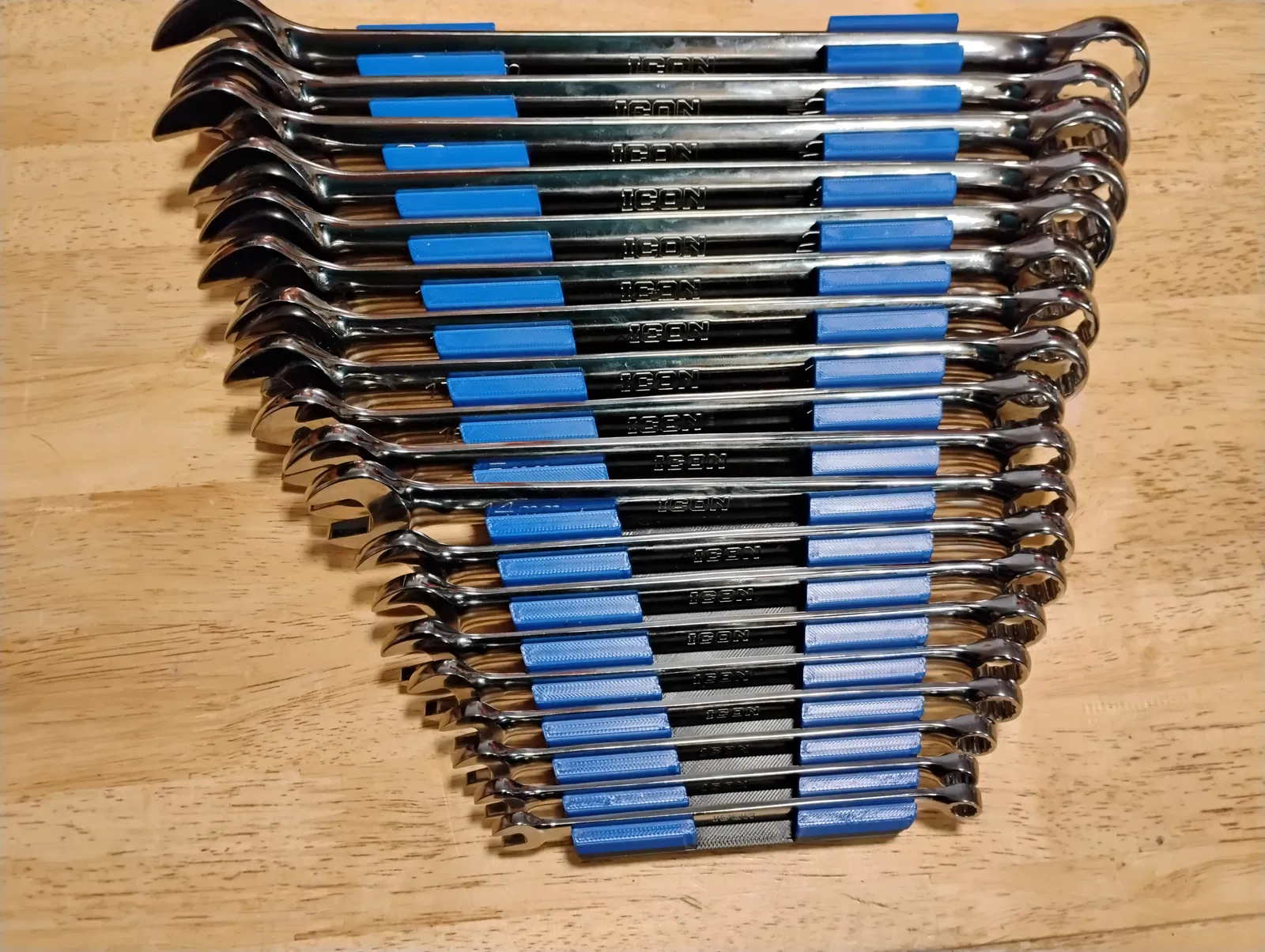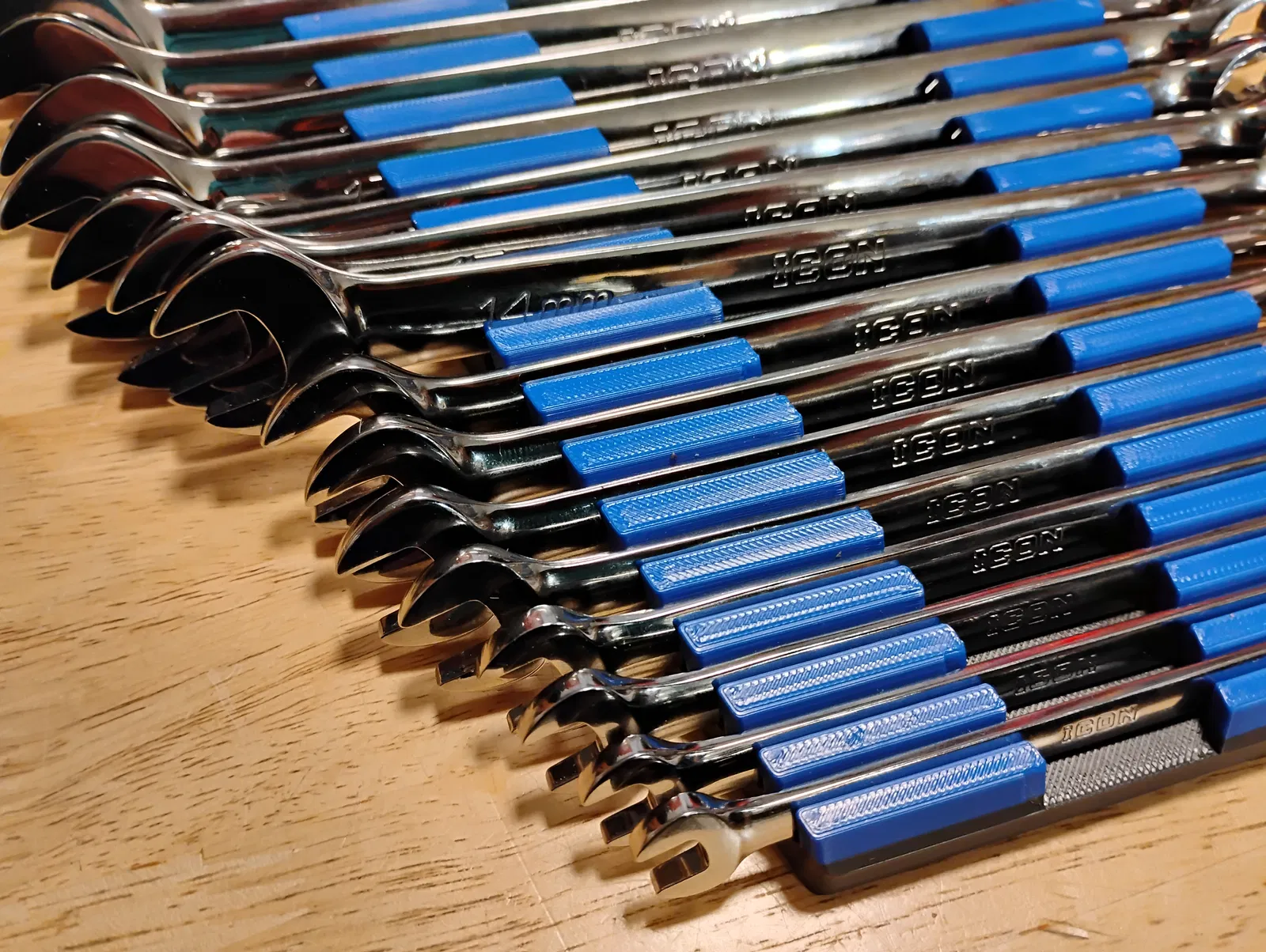 Giá đỡ cờ lê (Wrench Holder) tối ưu chỗ cho bộ ICON metric combination: 14 cây 5–19mm và 5 cây 20–24mm. Mẫu chia 2 phần để in máy nhỏ, kèm “flat key” gài đáy tăng độ chắc khi dán keo; có thể hợp hãng khác.