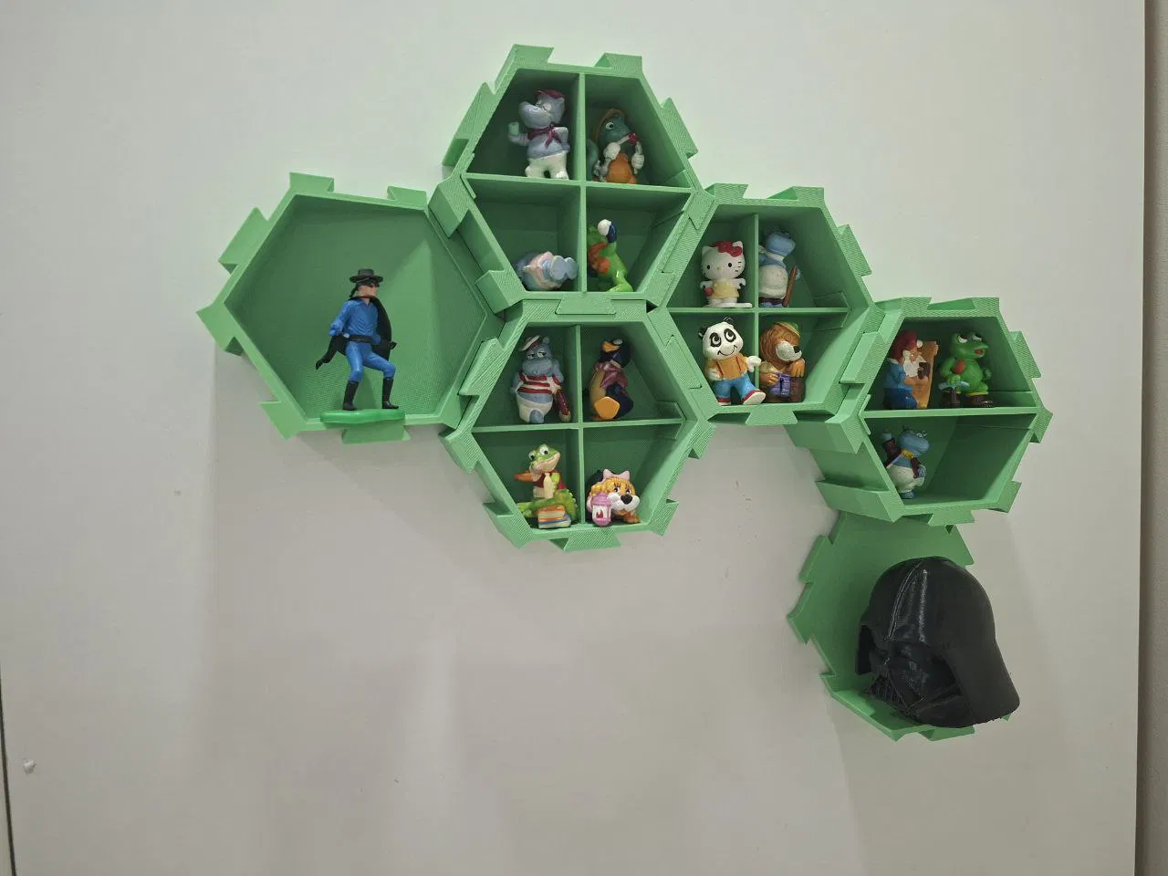 Hệ kệ lục giác mô-đun để trưng bày figure/đồ sưu tầm. Gắn tường bằng băng keo gel hai mặt (nano tape) nên không cần khoan hay vít. Khớp Dovetail trượt chắc, in dễ không cần supports, có inserts chia 2 hoặc 4 ô.