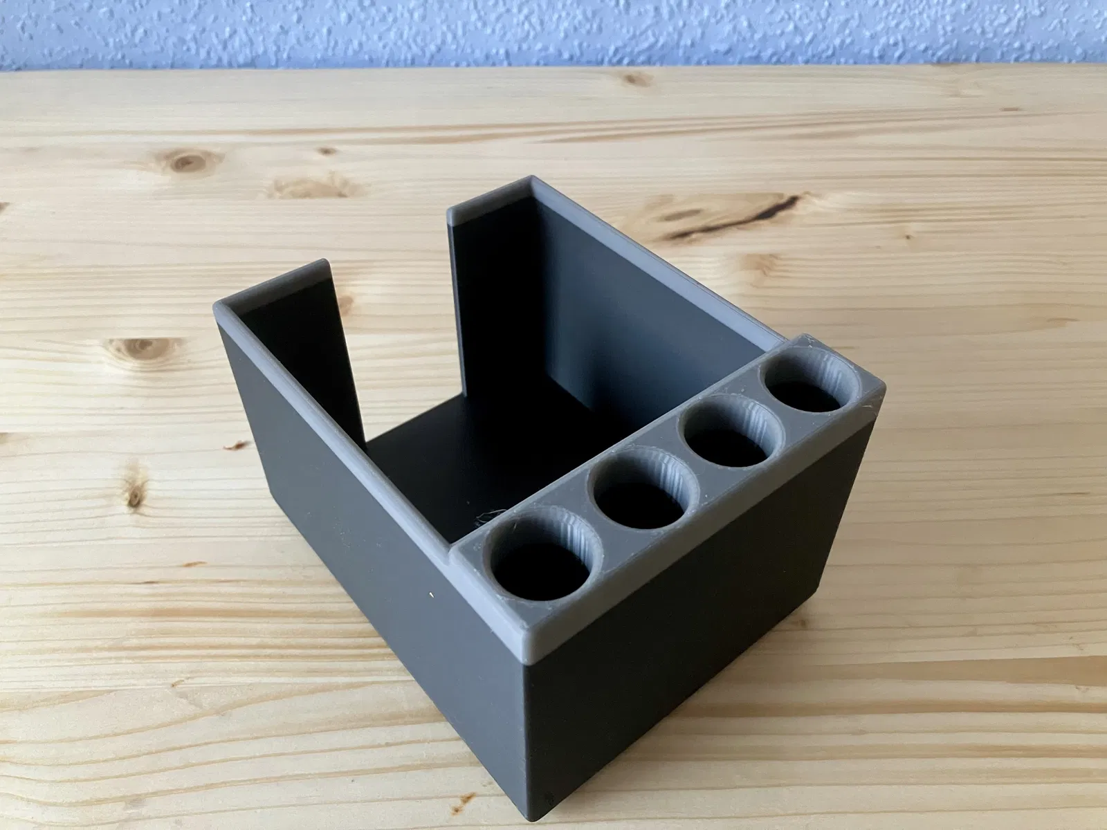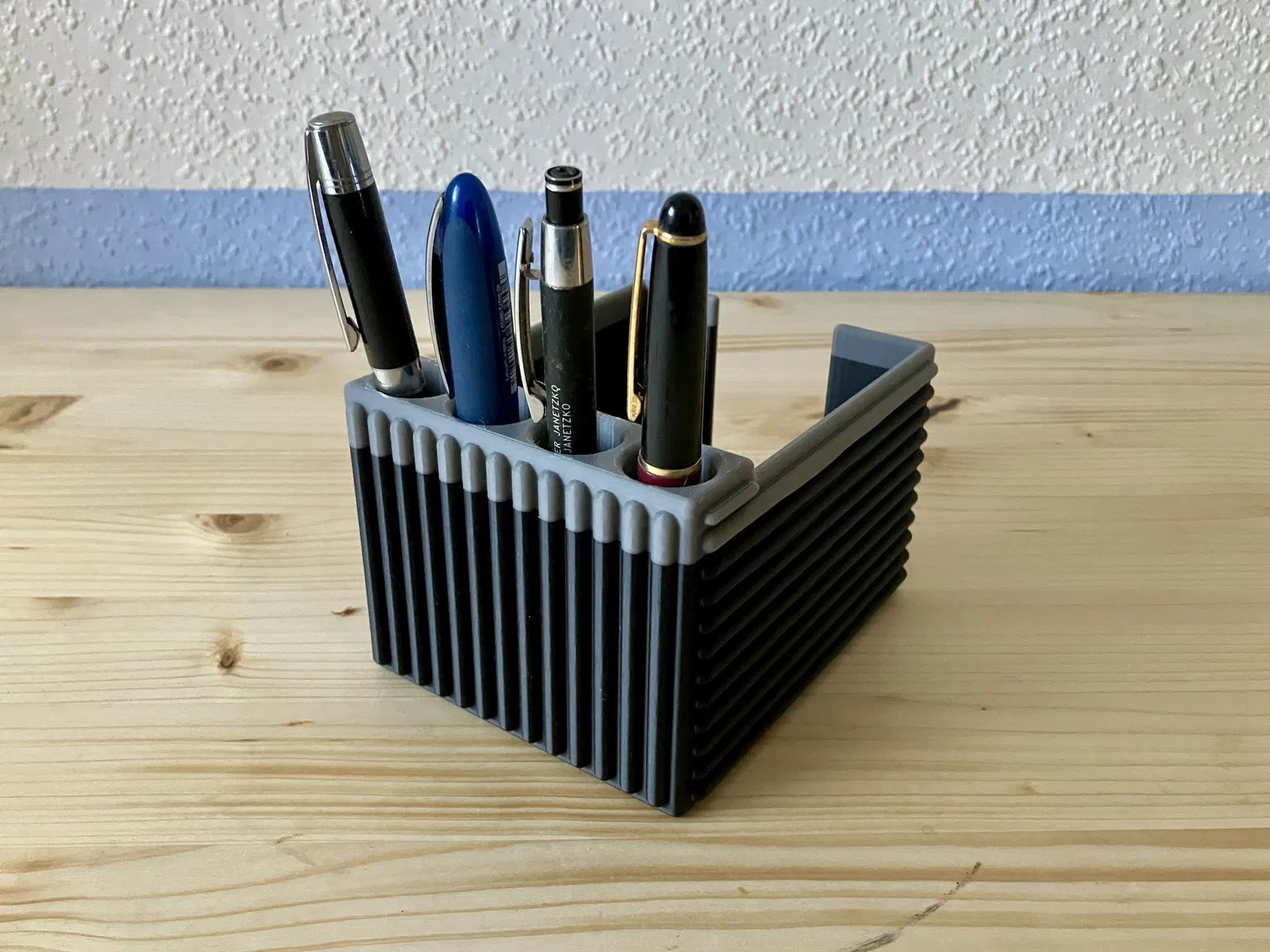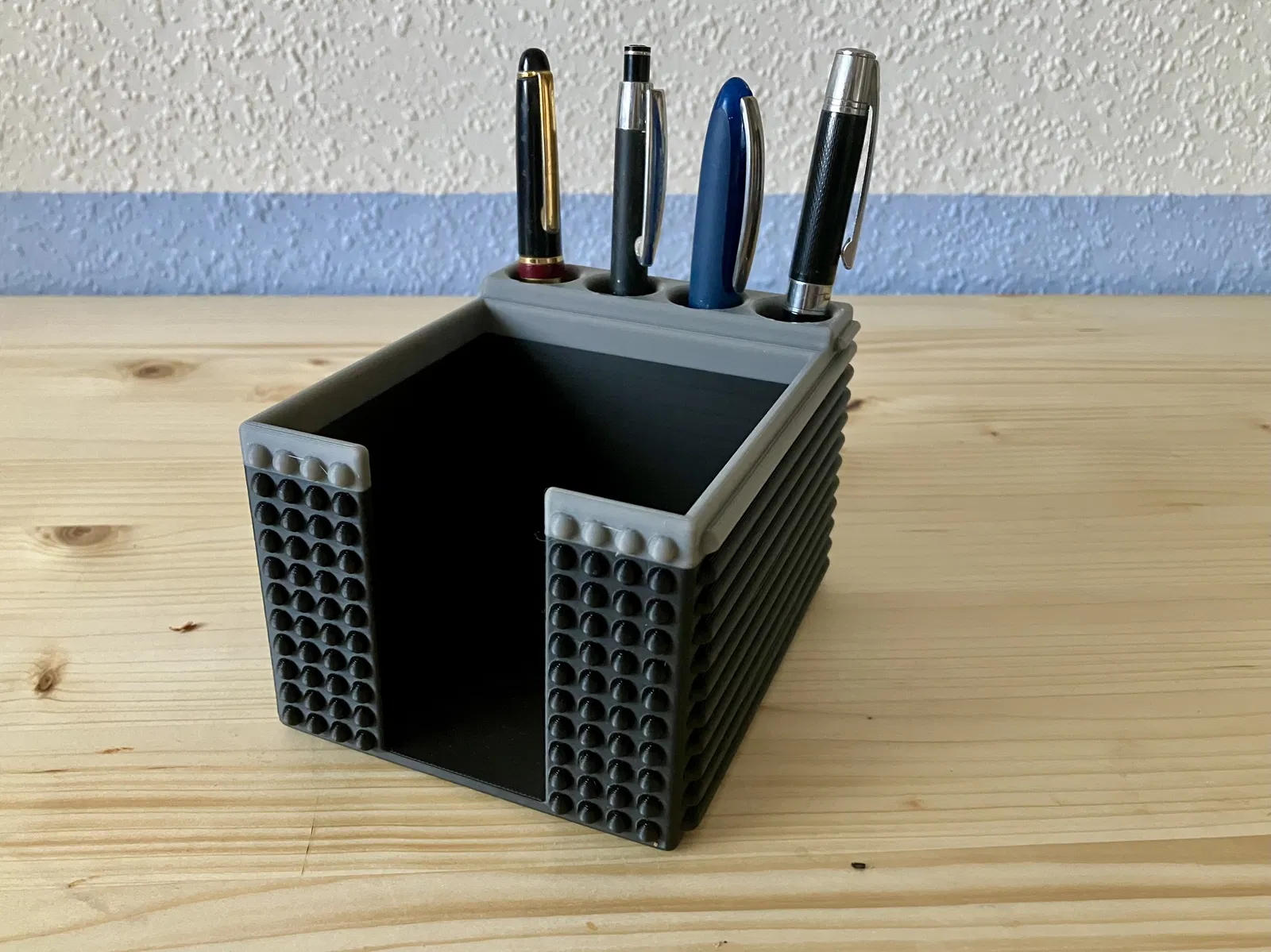 Hộp giấy note tiện dụng kèm 4 ống giữ bút (Ø20 mm), chứa được cả bút to. Hỗ trợ giấy 97x97 mm và có thêm profile cho chuẩn 90x90 mm. Có bản update “bọc giáp” bảo vệ giấy tốt hơn (90x90 mm).