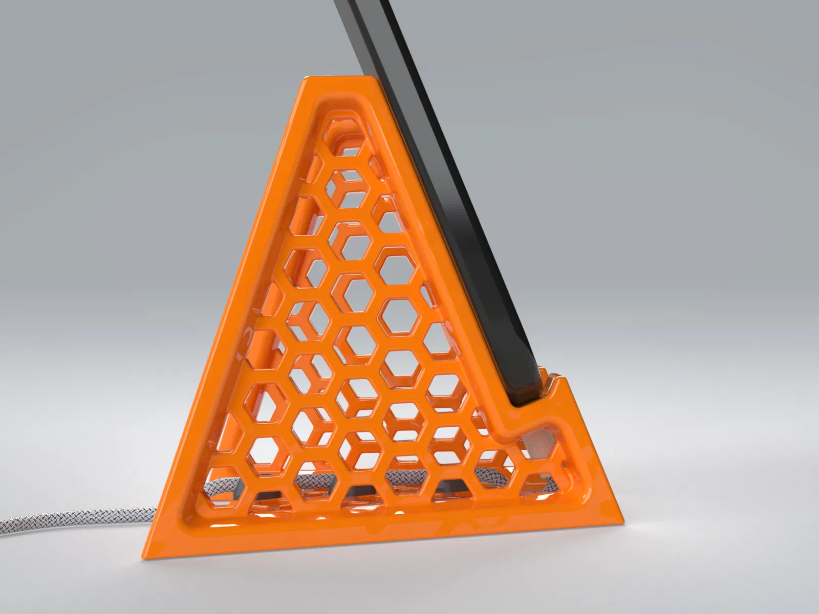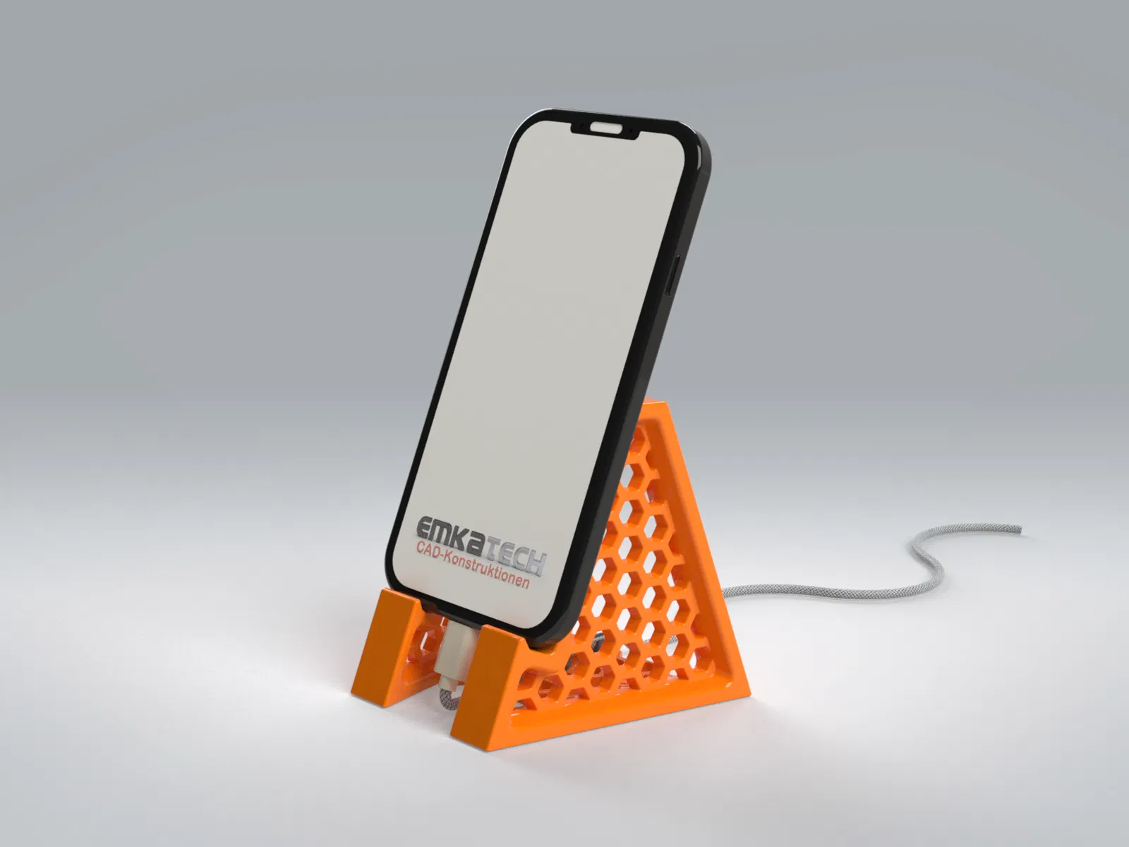 Kệ đỡ điện thoại tối giản, dùng được cả dọc lẫn ngang, tối ưu in 3D không cần support. Có lỗ luồn cáp lớn cho USB‑C/Lightning/Micro‑USB và kẹp giữ cáp gọn gàng, ổn định, in nhanh.