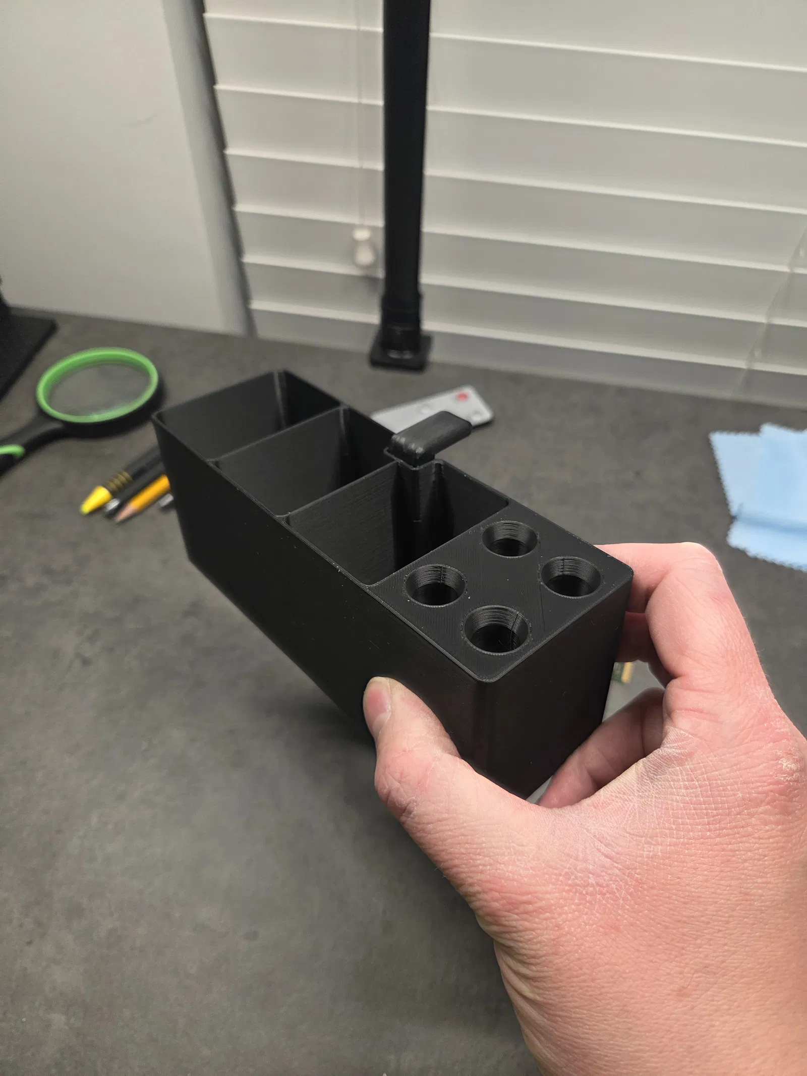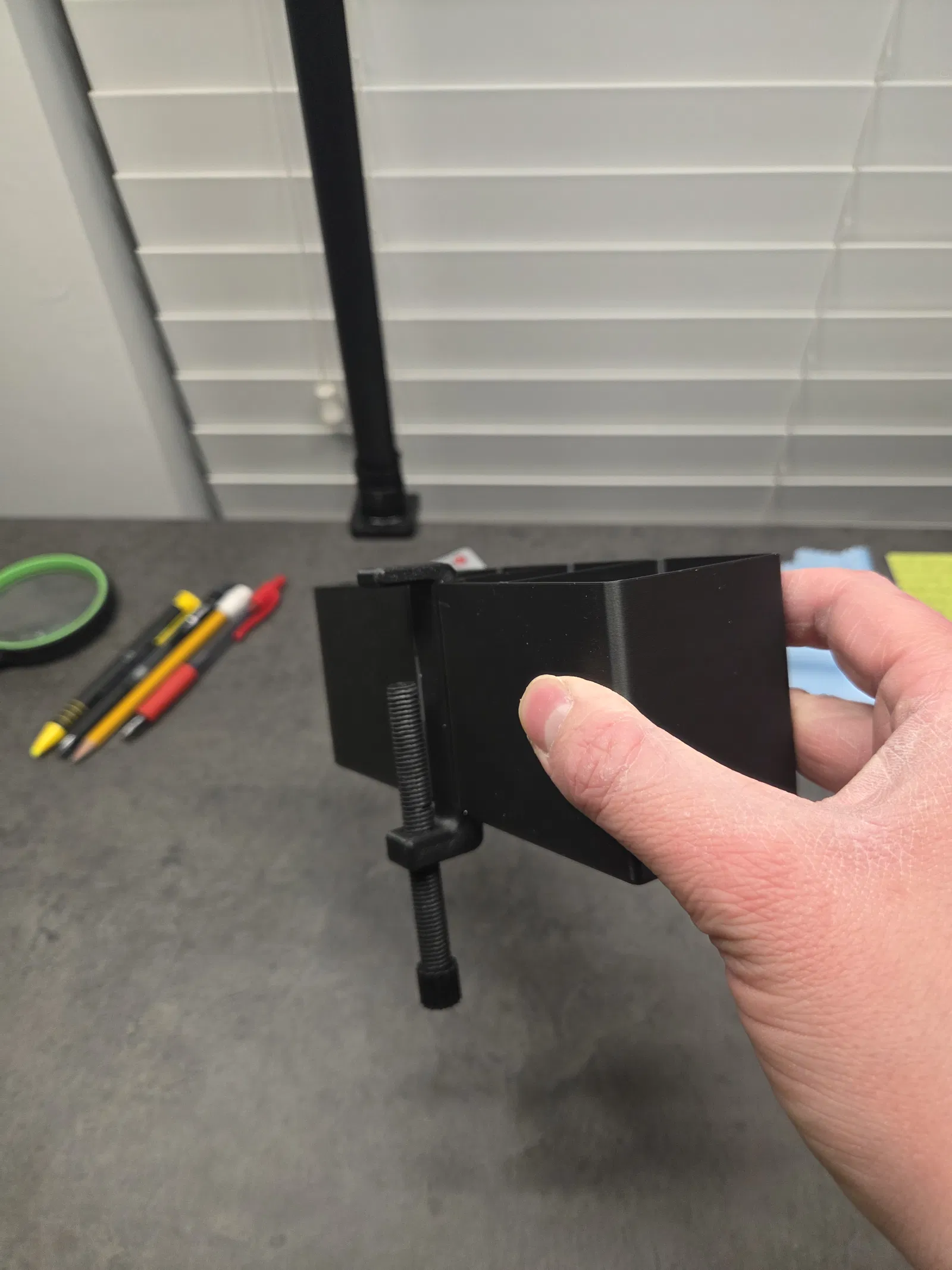 Mẫu Desk Mount Pencil / Bin giúp gắn lên mép bàn để cất bút và đồ lặt vặt gọn gàng, dễ lấy mà không chiếm chỗ. Bolt cần chẻ đôi khi in, canh đúng 3 lỗ để dán keo; ren đẹp hơn với 0.1mm và nozzle 0.4.