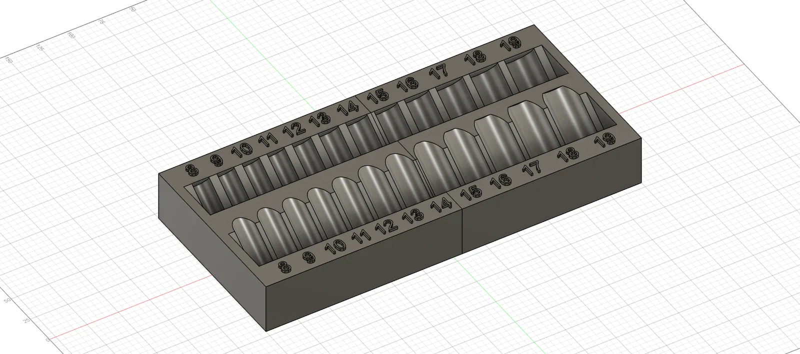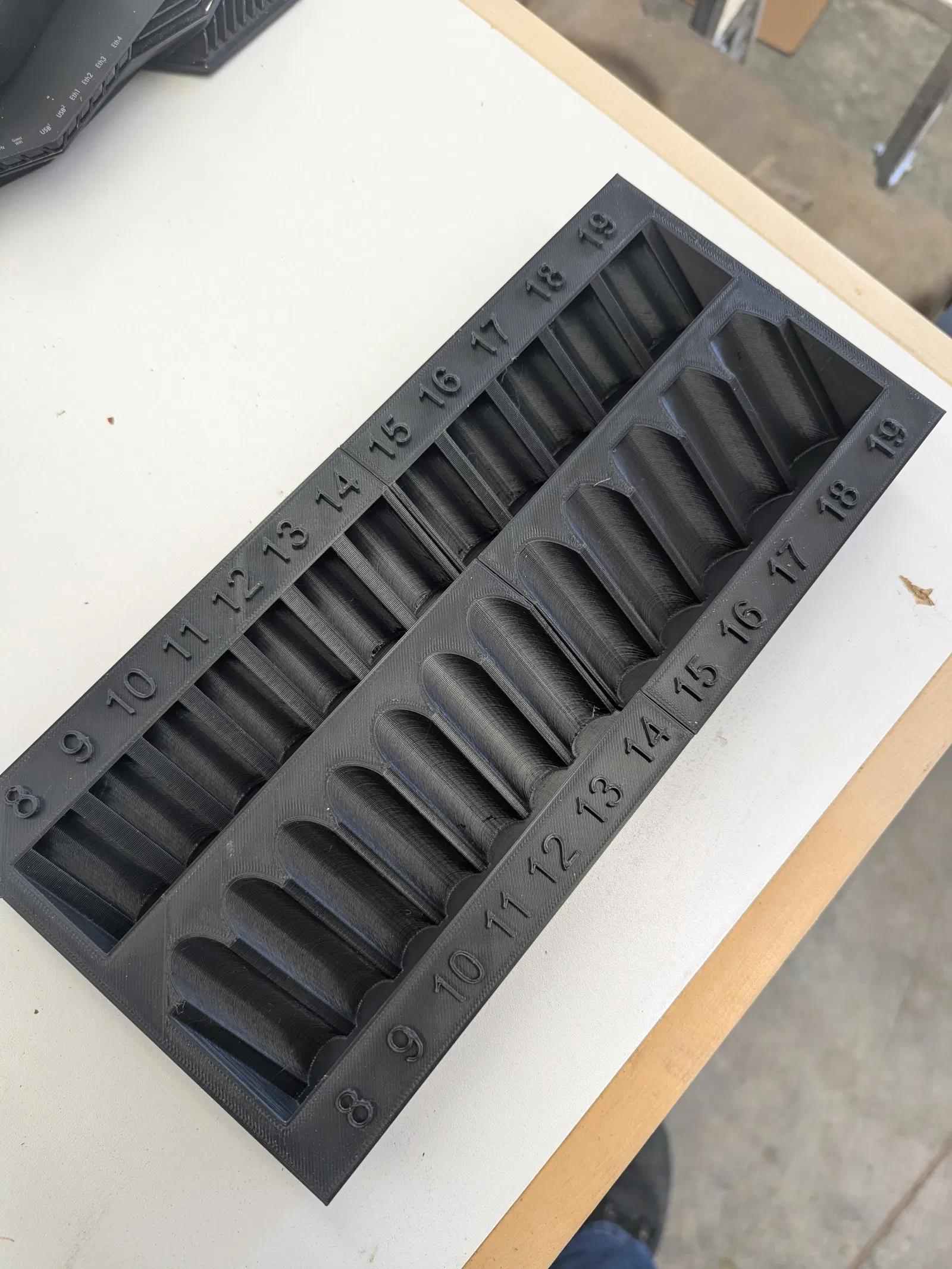 Kệ để socket dạng nghiêng cho ngăn kéo thùng đồ nghề, giúp dễ nhìn và dễ lấy socket. Có bản SAE và MM (MM v2 đồng bộ với SAE), thiết kế in 2 mảnh, có lỗ 3/8" để ghép bằng dowel.