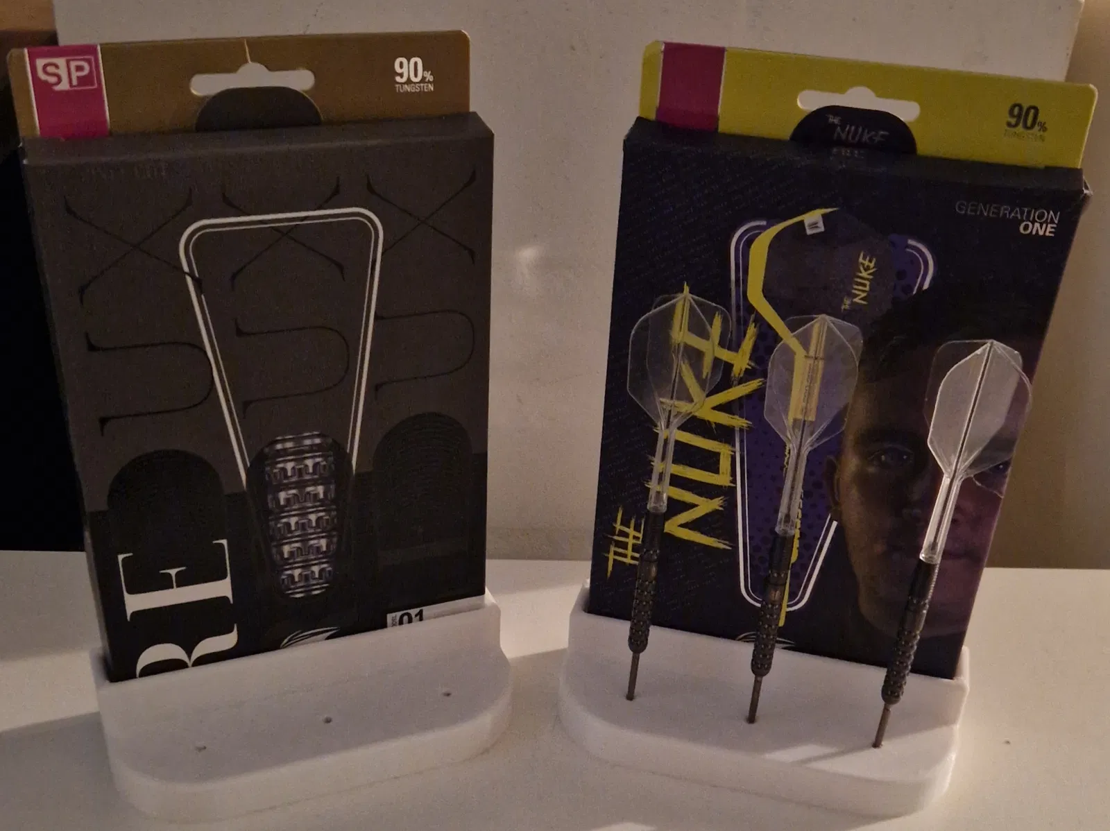 Kệ display để trưng bày darts cùng hộp gốc. Tương thích tối thiểu với hộp carton Target tiêu chuẩn, và có thêm phiên bản cho hộp Harrows. Có thể cần chọc lại lỗ cho dartpoints bằng kim/đinh hơ nóng.