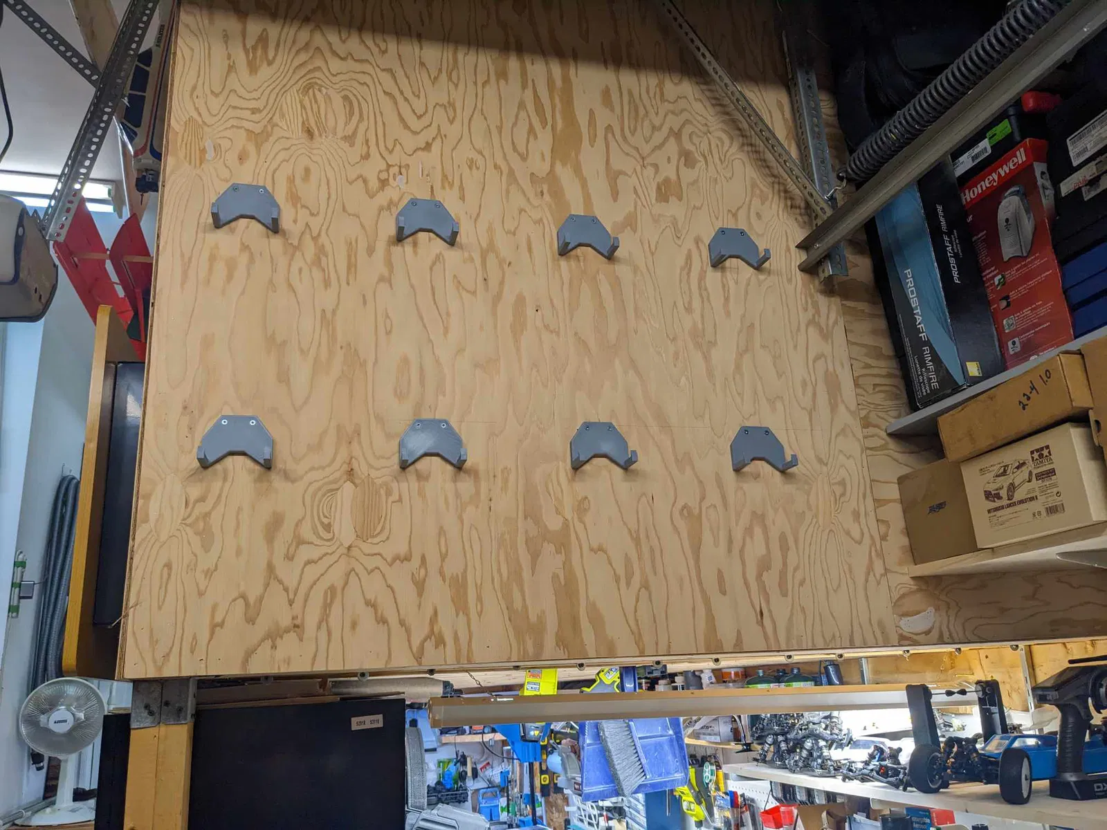 Tôi chỉ cần một chỗ để lưu trữ một số chiếc RC của mình và có một bức tường trong gara của tôi chưa được sử dụng, vì vậy tôi đã nhanh chóng vẽ và in một số móc cho chúng… “ET VOILA” ;-)