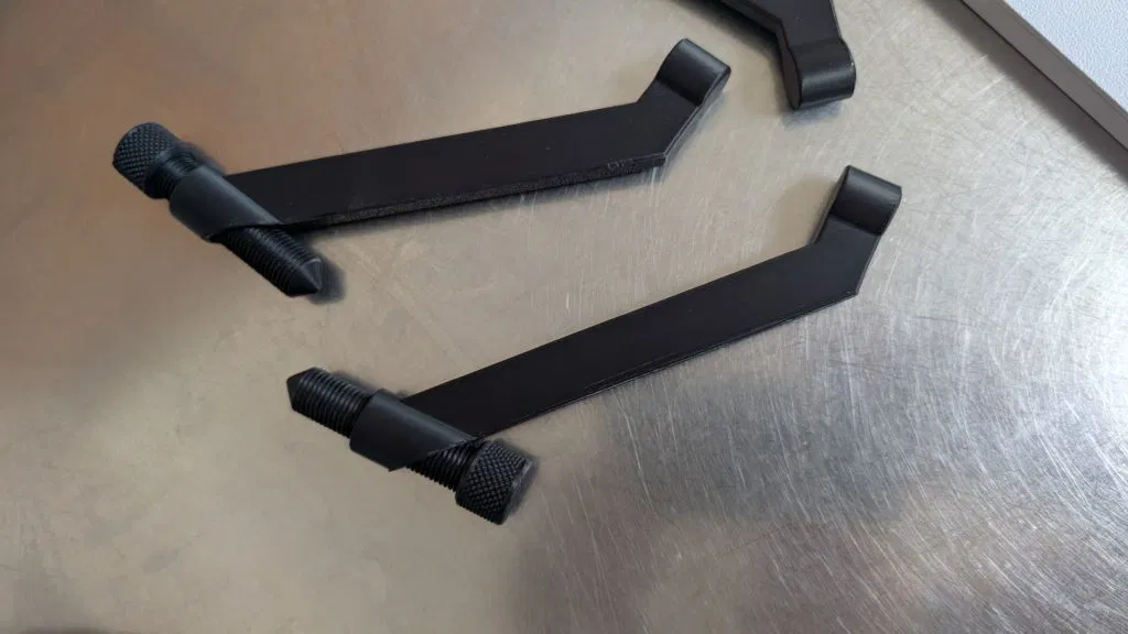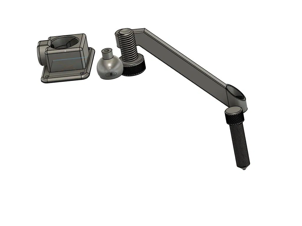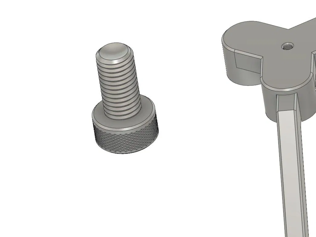 Thumbscrew cho ball clamp dùng ren danh nghĩa M18x2.5. Ren cái (female) đã được nới 0.2mm để dễ ăn ren. "screwpeg" dùng ren danh nghĩa M15x1.5. Ren tương ứng trong phần chân (leg) cũng được nới 0.2mm. Screwpeg có thể xoay để dùng mặt "foot" phẳng hoặc đầu nhọn, phù hợp với nhiều loại bề mặt khác nhau.