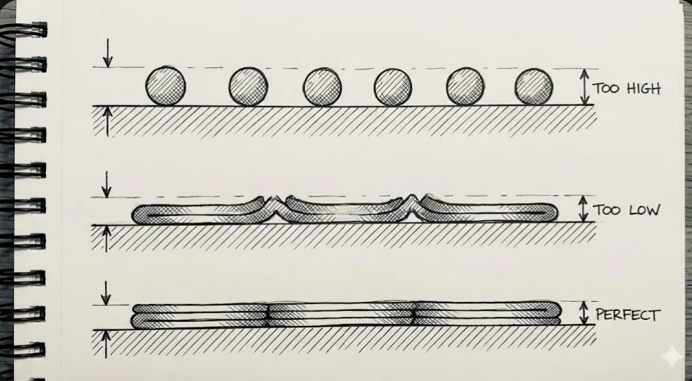 • Quá cao: Đường in nhìn như sợi dây tròn/chuỗi. Bám kém.