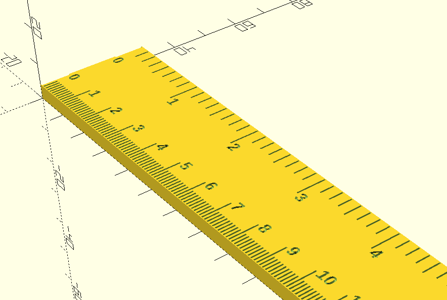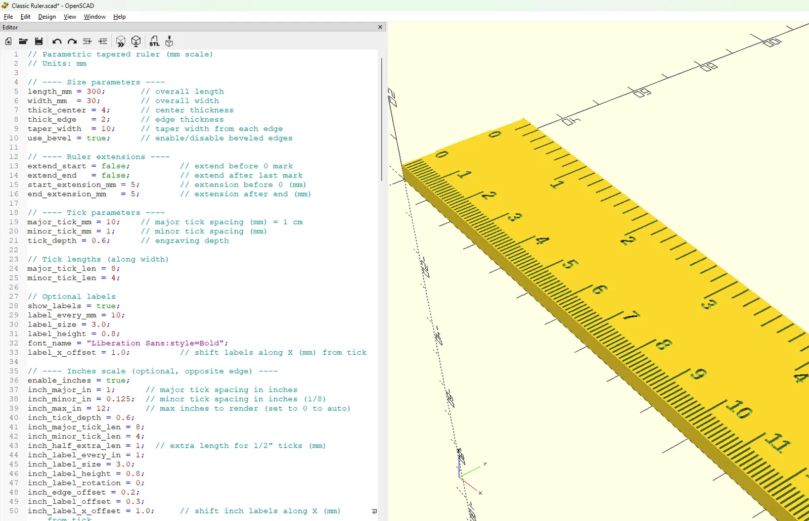 File nguồn .scad của thước đơn giản này có đính kèm và bạn có thể tải về để render phiên bản của riêng mình — một cây thước tuỳ biến rất mạnh.
