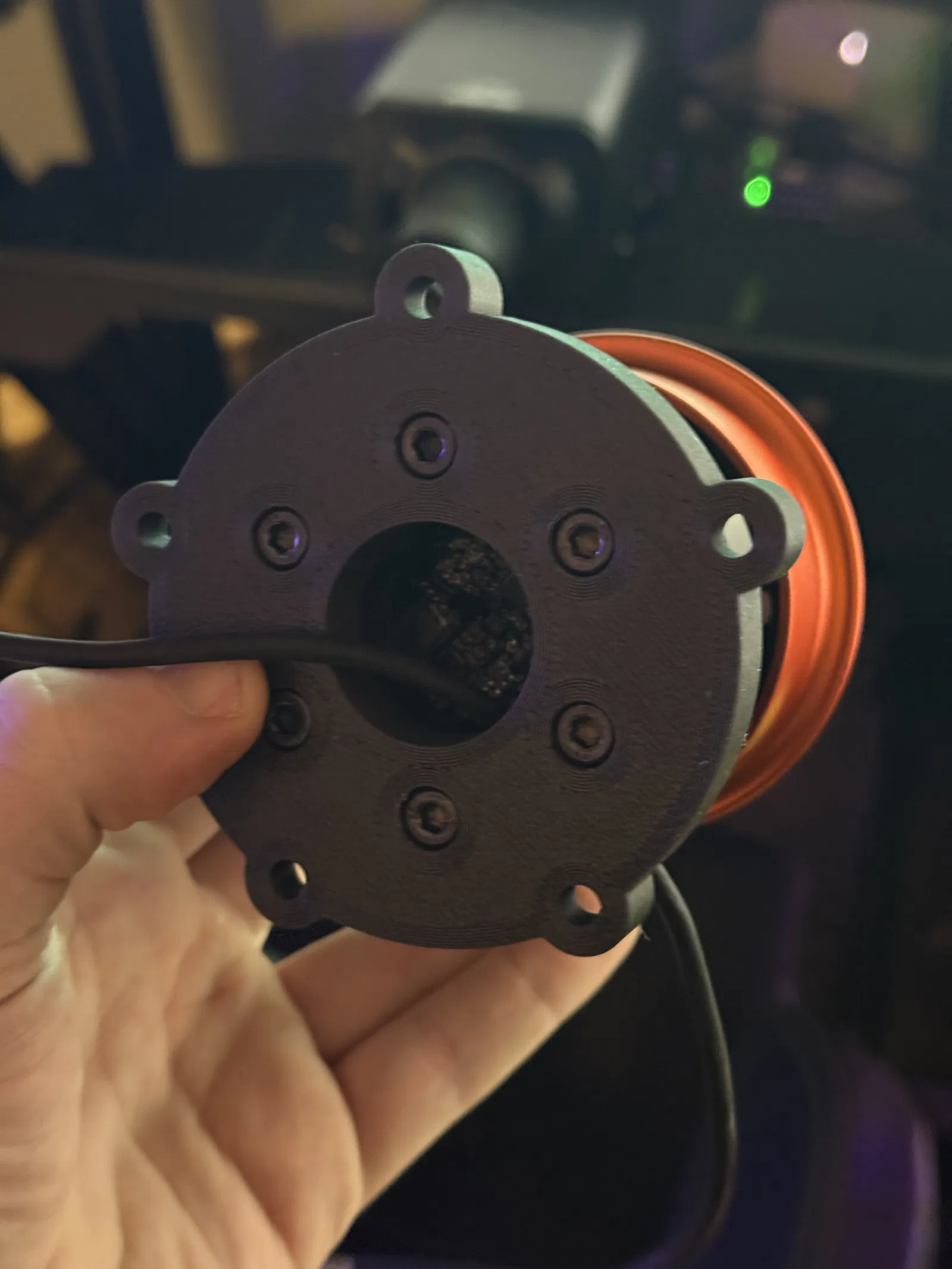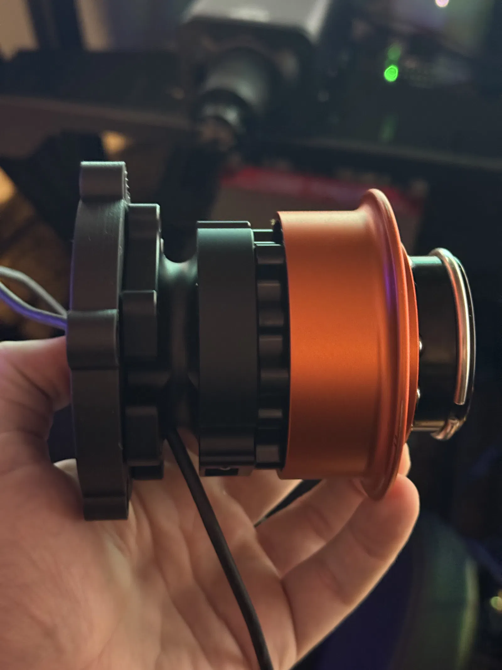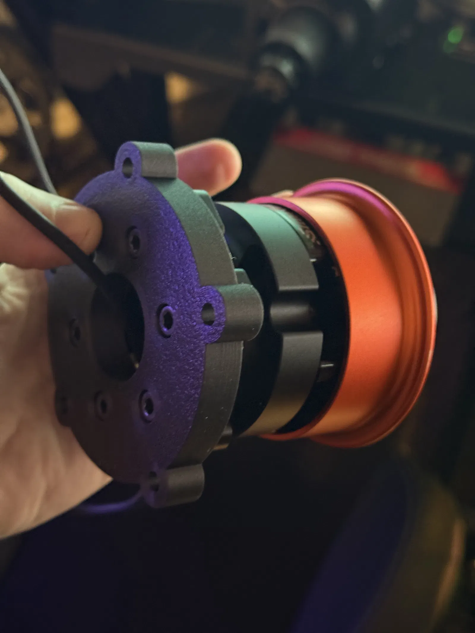 Fitment thì khỏi chê, có khe để luồn dây USB-C to USB-A xuống Simagic QR-A (hoặc universal adapter khác), và rất là cứng cáp. Mình khuyên in PETG CF, hoặc PLA CF. Mình đã dùng cả hai cho các biến thể khác nhau của plate này và cái nào cũng ổn. Khuyên in kiểu 70% infill, layer 0.20 mm, rồi cứ in thôi. Infill nghe hơi “dư”, nhưng nhờ vậy mình siết lực ốc mạnh tay mà không lo plate hay wheel bị yếu; kể cả với wheel 18nm thì cũng không có chút rung/độ flex nào. Cảm giác y như một tấm plate kim loại đặc vậy.