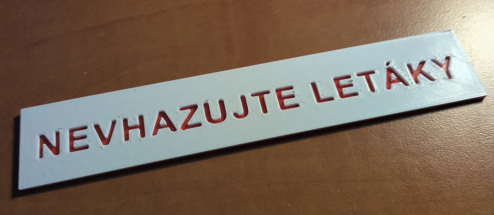 Bảng “Nevhazujte letáky” dán lên hộp thư giúp giảm rõ rệt lượng tờ rơi bị nhét vào. Có kèm mã nguồn OpenSCAD để dễ chỉnh kích thước hoặc nội dung. Khuyến nghị đổi filament giữa chừng để đúng thẩm mỹ.