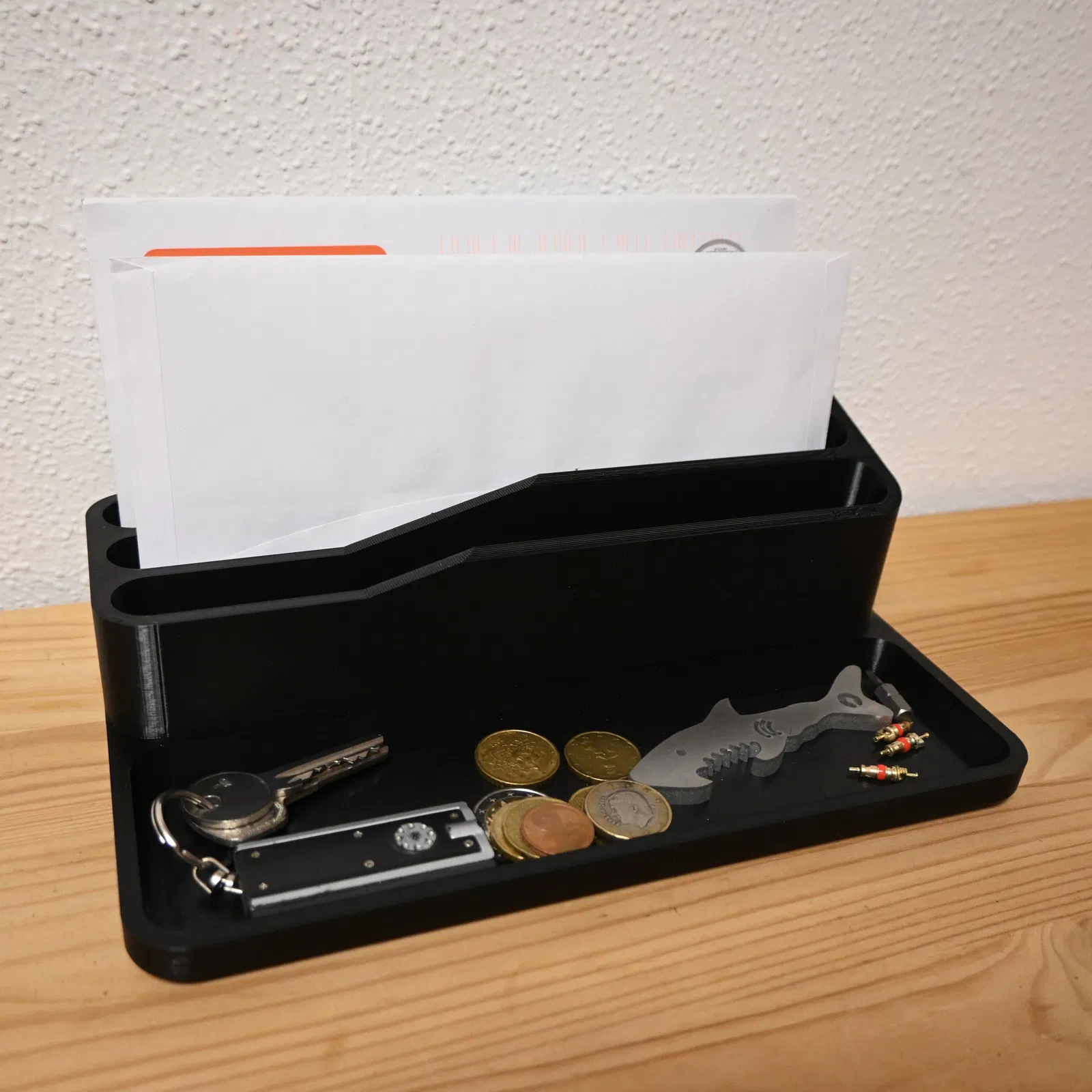 Organizer đựng thư với 3 ngăn lệch bậc (chênh cao 10 mm) giúp nhìn rõ và lấy thư dễ dàng, kèm khay nhỏ để cất chìa khóa, tiền xu. Kích thước 250×155×80 mm, phù hợp hầu hết máy in 3D tiêu chuẩn.