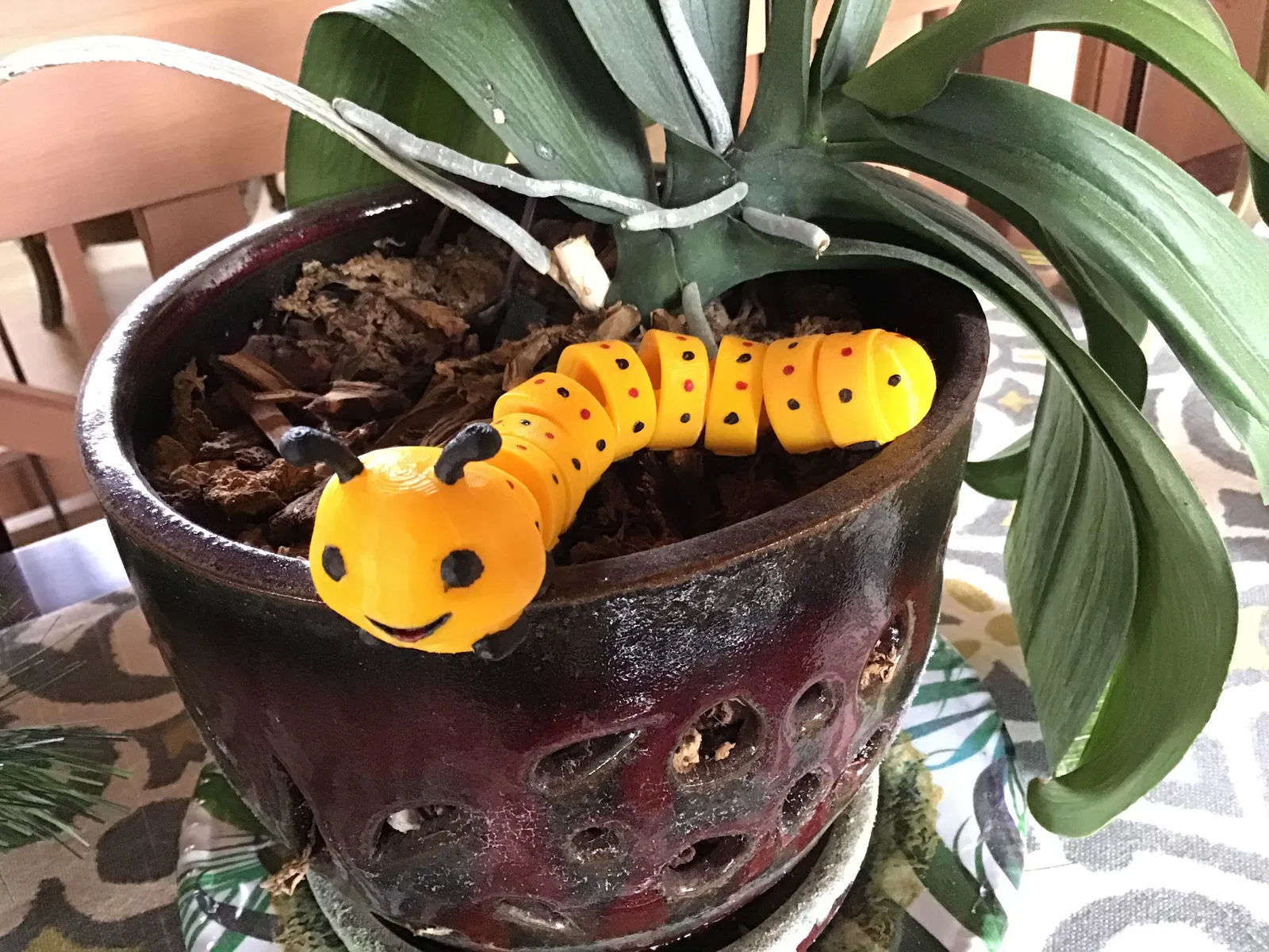 Sâu bướm print-in-place dễ thương với 9 khúc khớp nối, dài khoảng 130mm. In không cần supports, phù hợp làm đồ chơi hoặc đồ trang trí cho chậu cây/nhà có cây xanh.