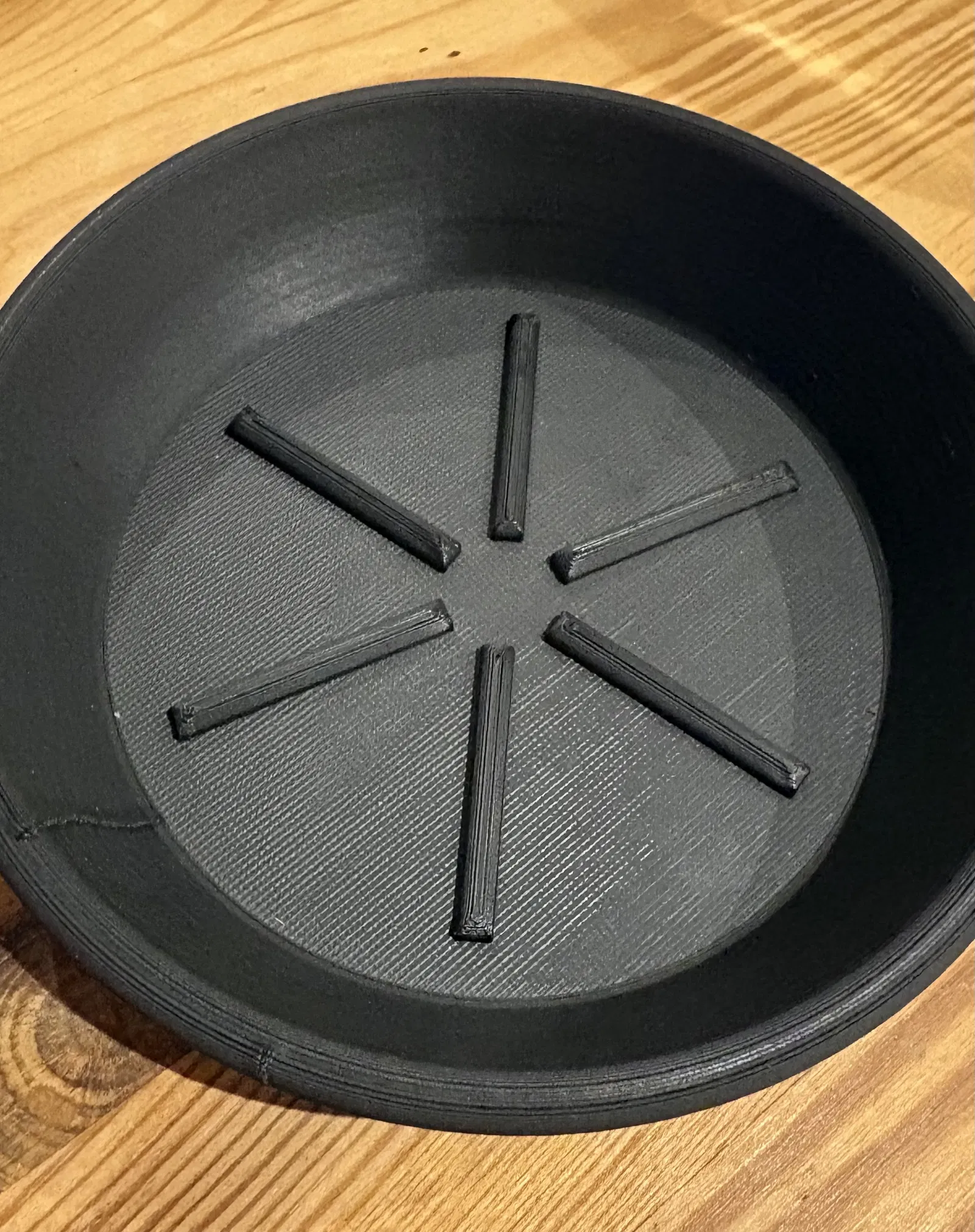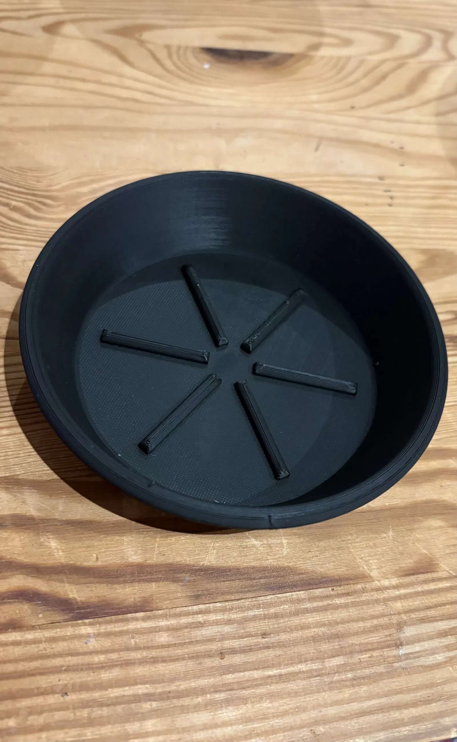 Mẫu đĩa lót cho chậu cây (plant pot saucer) có lỗ thoát nước, giúp hứng nước dư và giữ khu vực đặt chậu sạch sẽ. Kích thước: đường kính 89 mm, cao trong 24.5 mm, cao ngoài 27.4 mm.