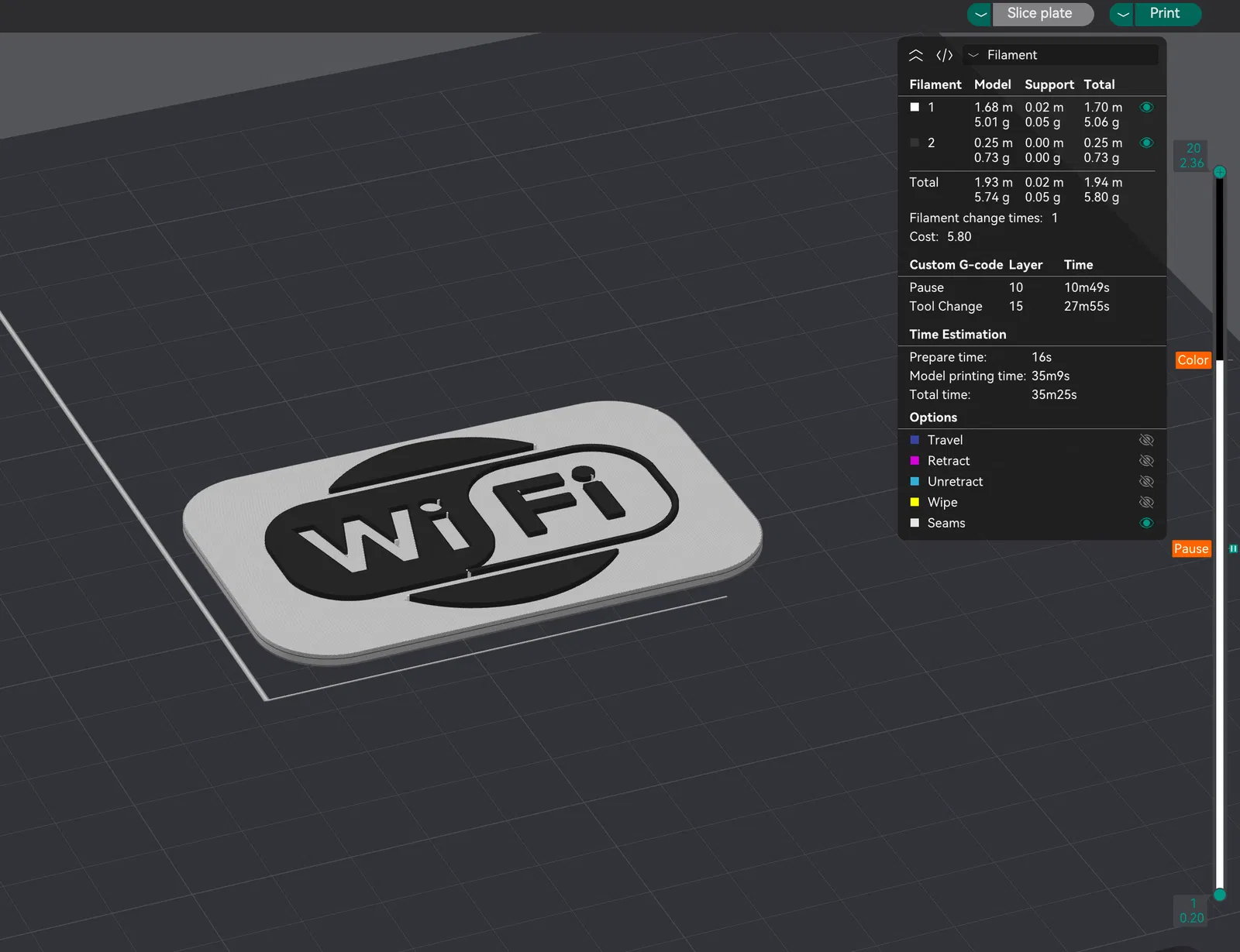 Mình in bằng ELEGOO PLA+ RAPID WhiteELEGOO PLA+ Black (nếu bạn cần tham khảo). Ngoài ra, mình bật ironing cho tất cả bề mặt trên cùng.