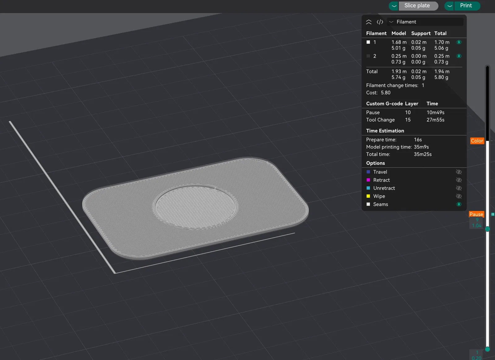 Thêm một đoạn pause trong slicer trước khi phần khe hở bị phủ kín. Sau đó, đặt thẻ 25mm của bạn vào bên trong rồi tiếp tục in.