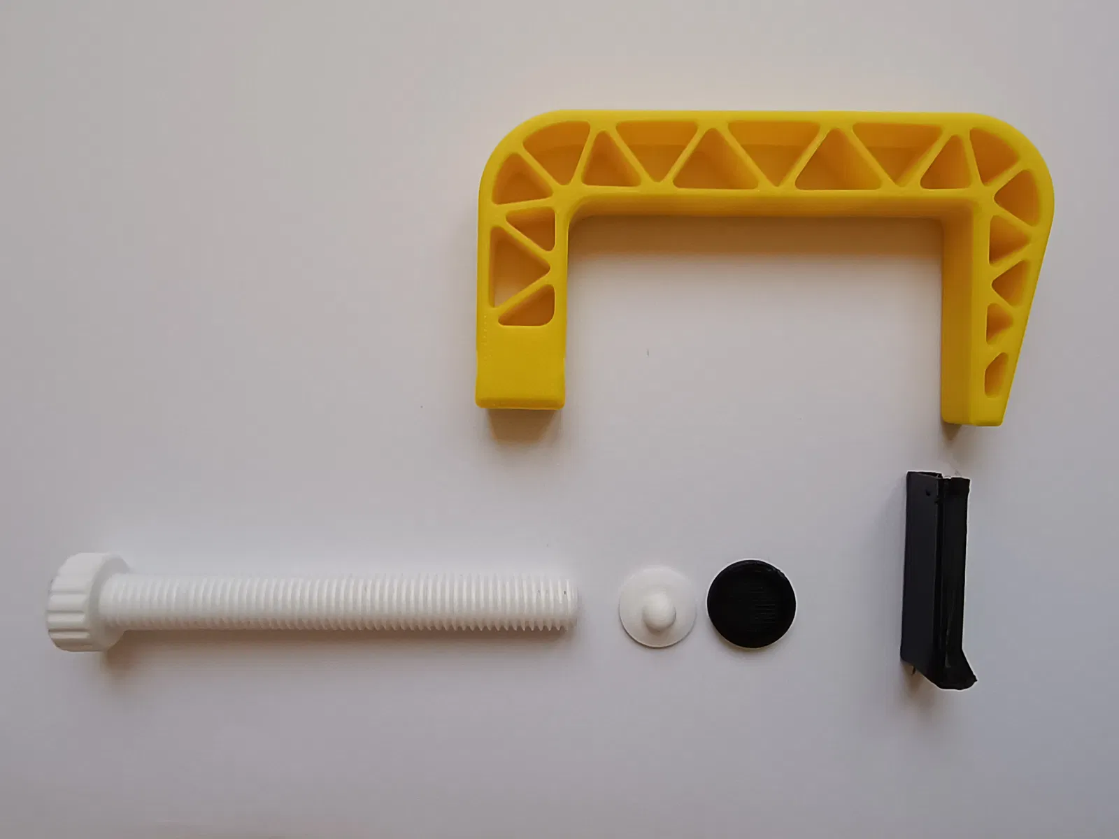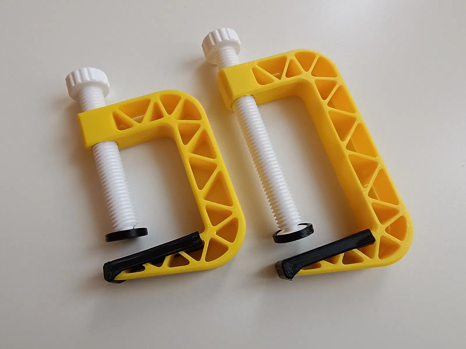 Bộ Light C-Clamp cho ứng dụng tải nhẹ, gồm 2 kích thước 45 mm và 65 mm, dùng ren M10. Có đầu swivel giúp lực ép đều và nắp chụp snap-on (khuyến nghị in TPU). Gợi ý layer height để ren chạy mượt.