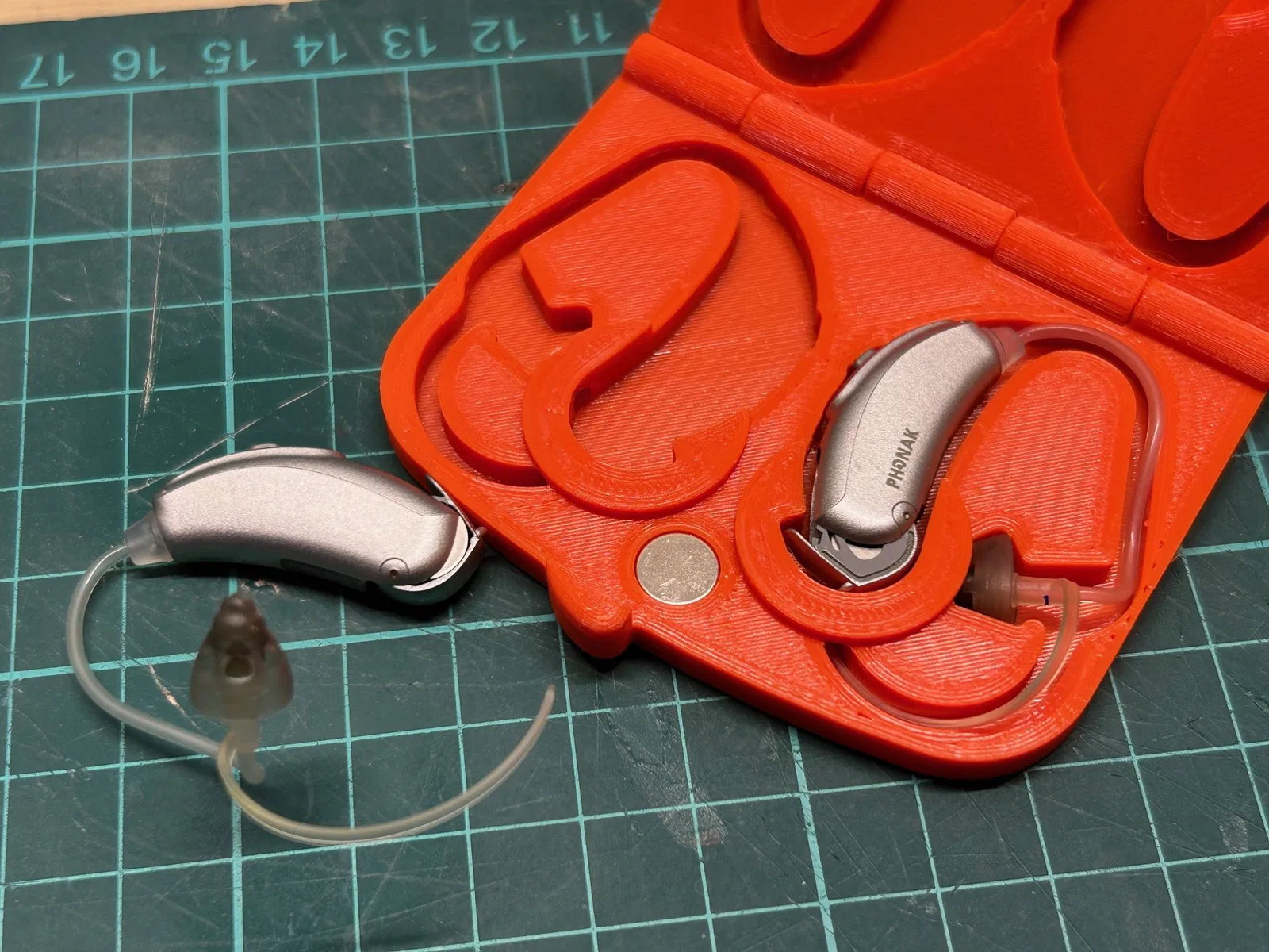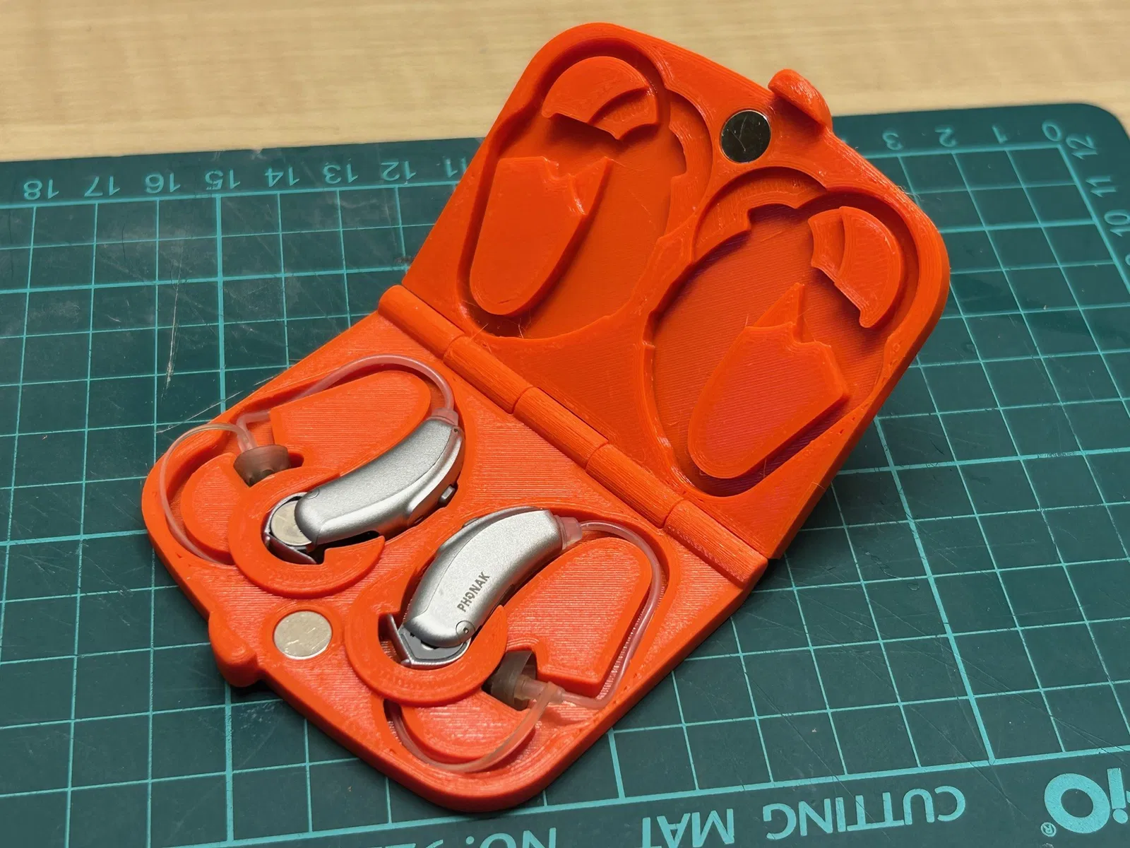 Hộp đựng dạng clamshell PIP (có bản lề) cho máy trợ thính Phonax (NHS). Có chừa khoảng trống để mở nắp khoang pin nhằm tắt máy trợ thính khi cất. Thiết kế low profile — dày 10mm khi đóng. Có các hốc để gắn 2 nam châm 8mm (sâu 2mm) giúp đóng gài kiểu clasp.