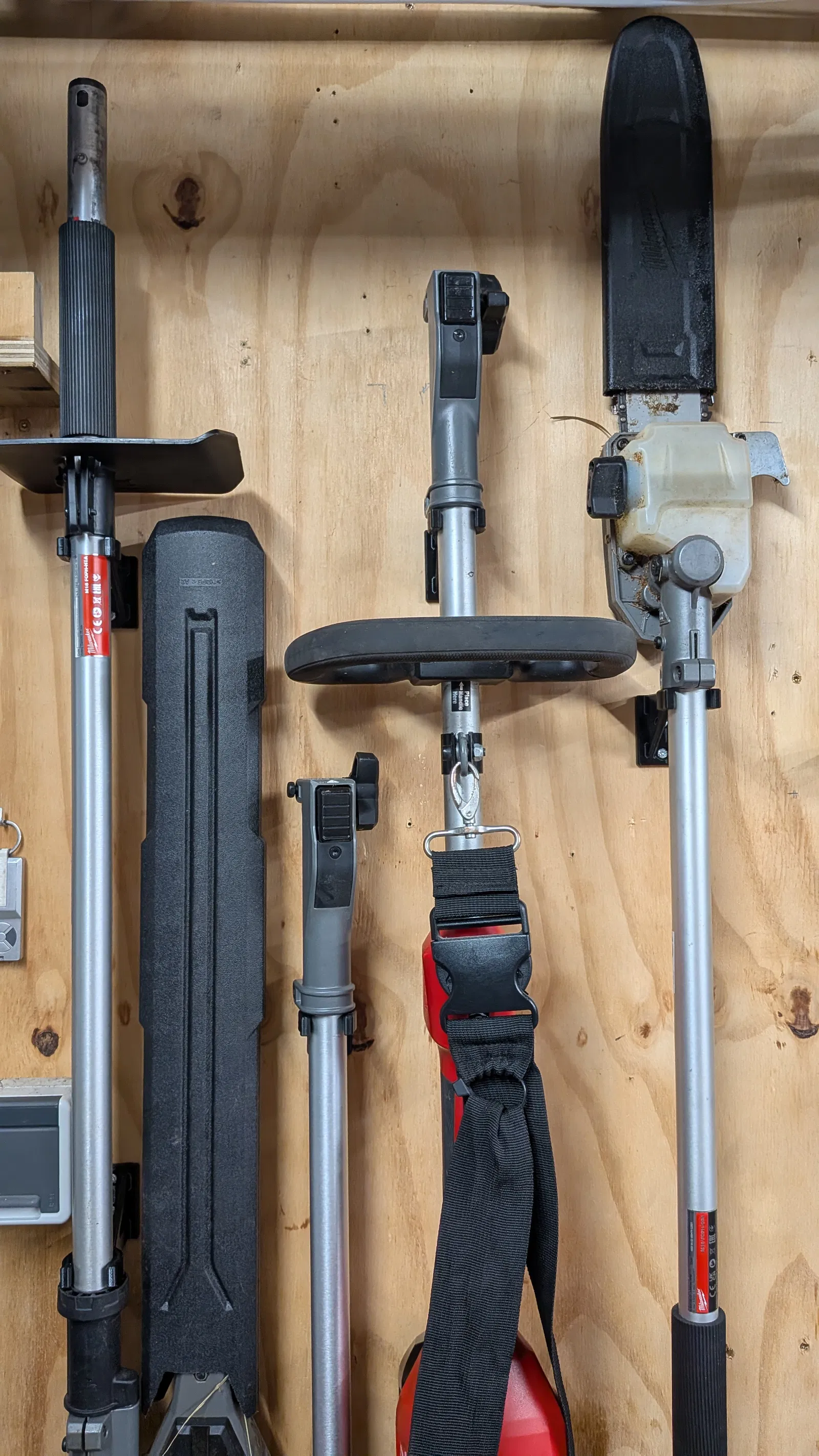 Nhờ có gân đỡ chéo, giờ mình có thể treo an toàn cả thân máy chính chỉ bằng một clip. Riêng đầu Hedge Trimmer thì cần hai wall clips, vì trọng tâm của đầu này không nằm ở giữa trục.