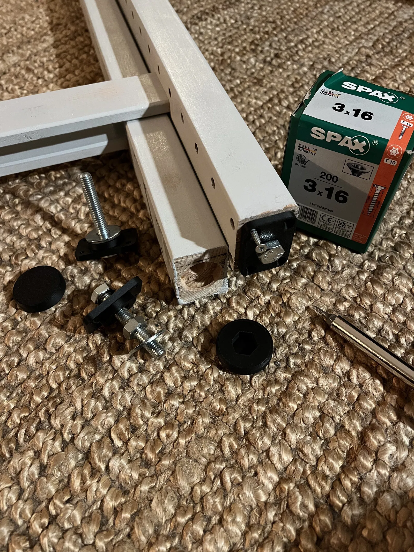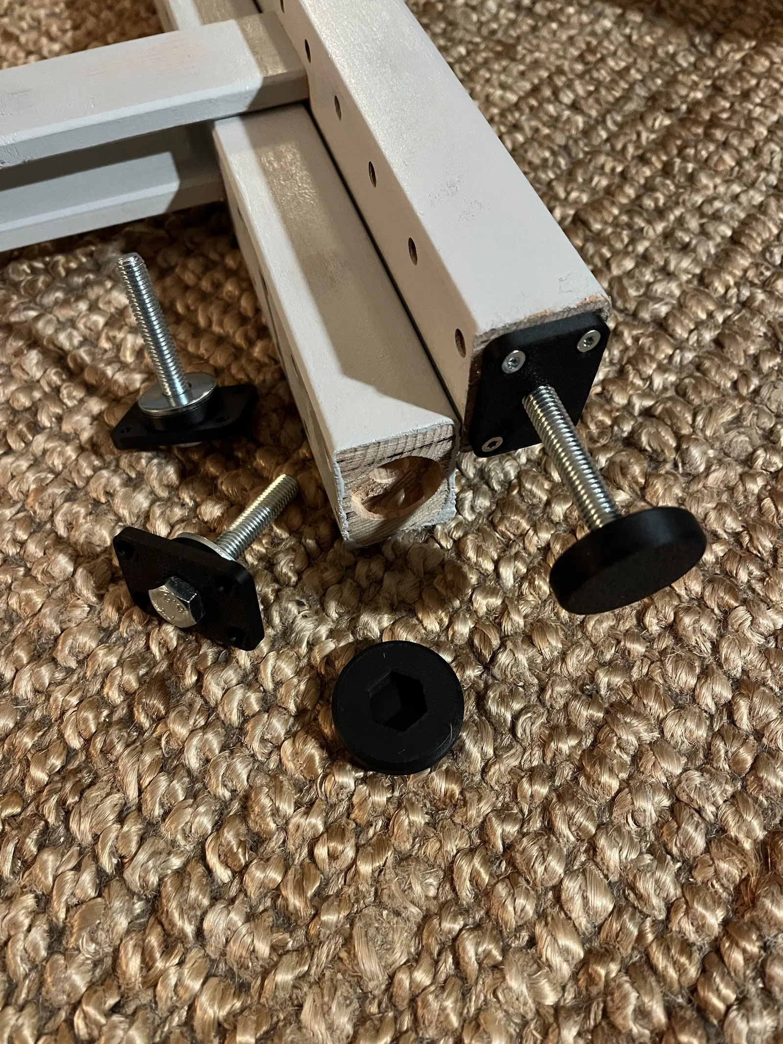 Sau khi khoan xong các lỗ, bạn có thể lắp các phần vào chân như trong hình. Thứ tự: Washer - Nut - Plastic - bolt - plastic.
