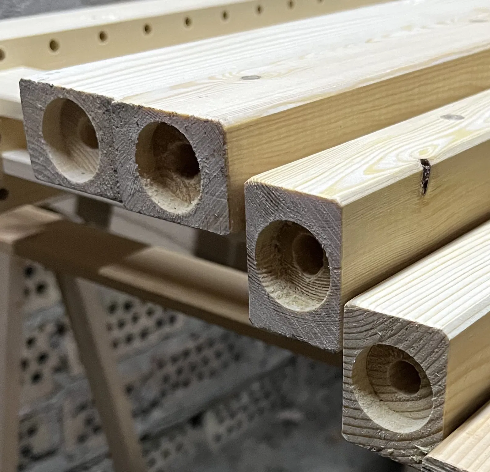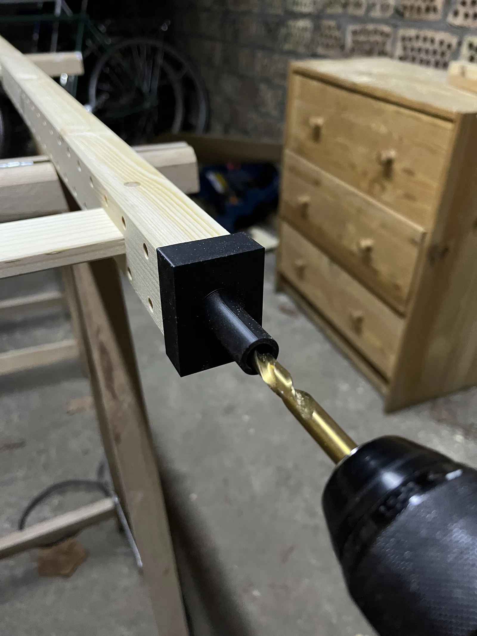 Có 2 cái đồ gá khoan nhỏ. Một cái cho mũi khoan Forstner 25mm, cái còn lại cho mũi khoan gỗ 10mm. Nhớ dùng mũi sắc nha ;)