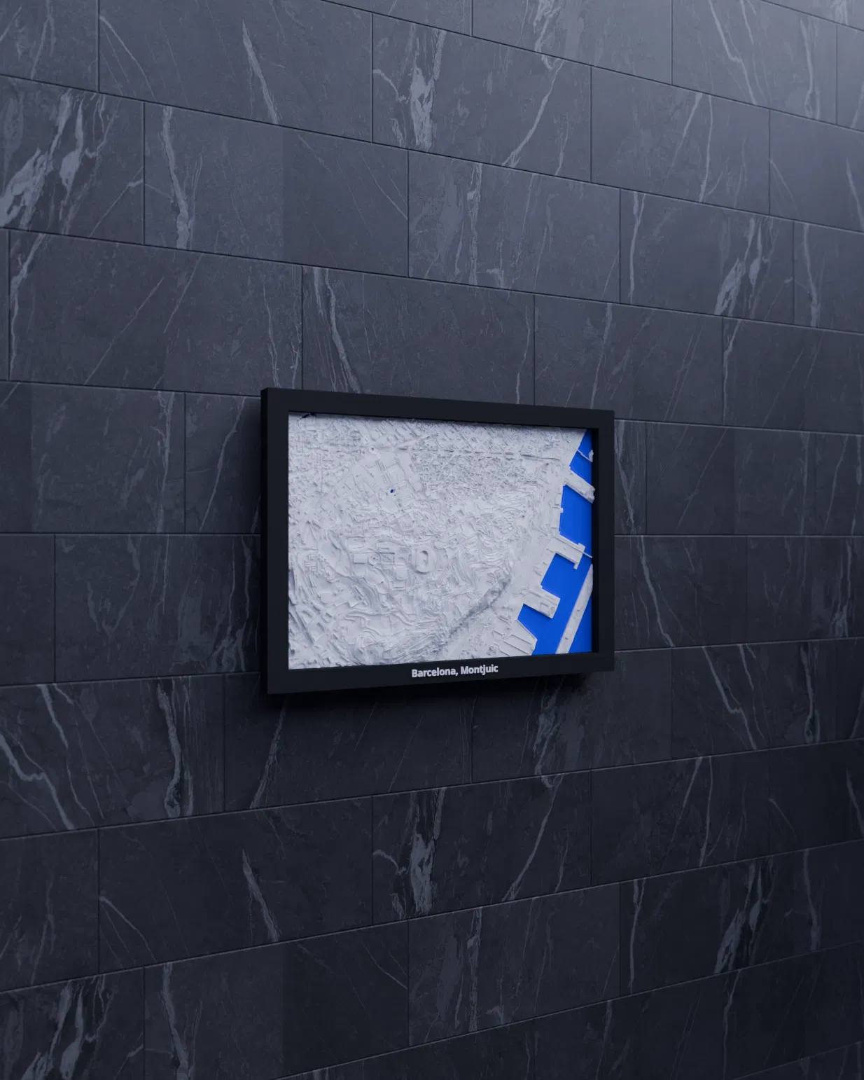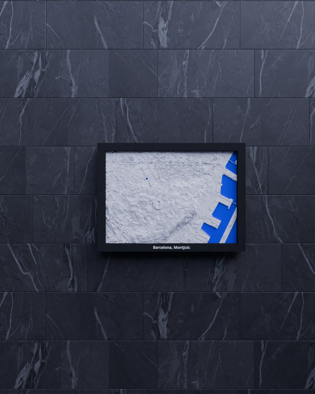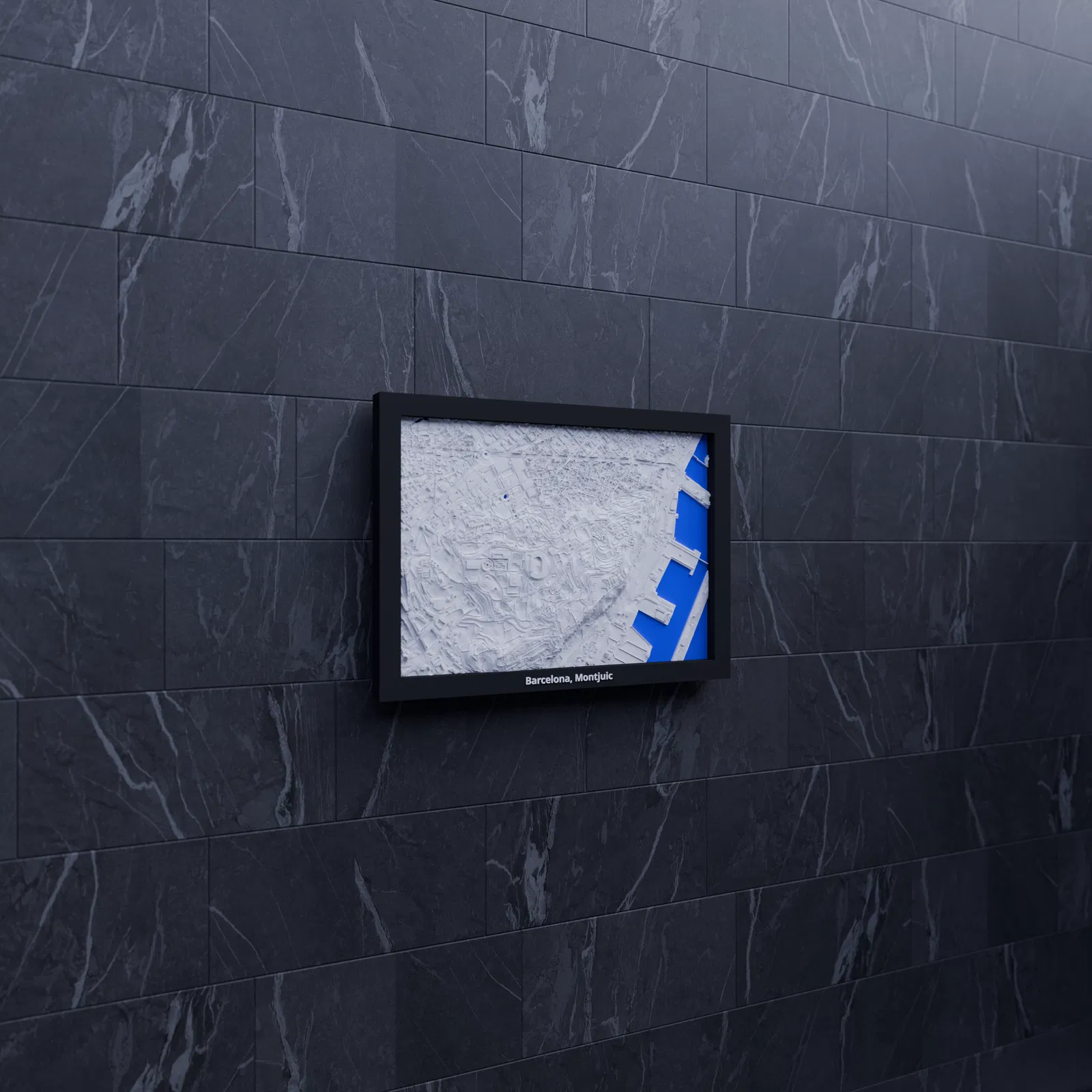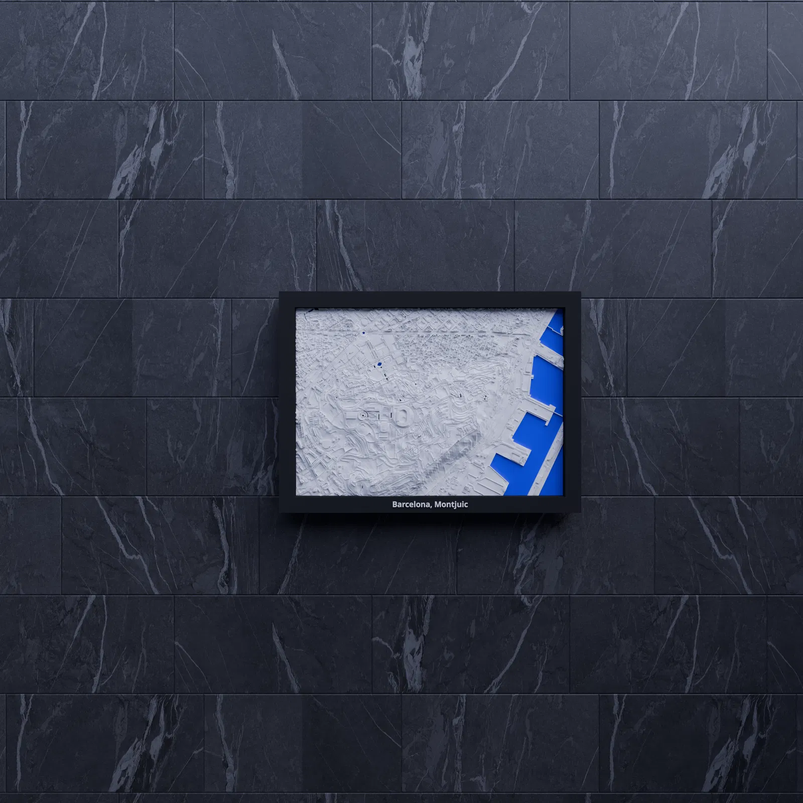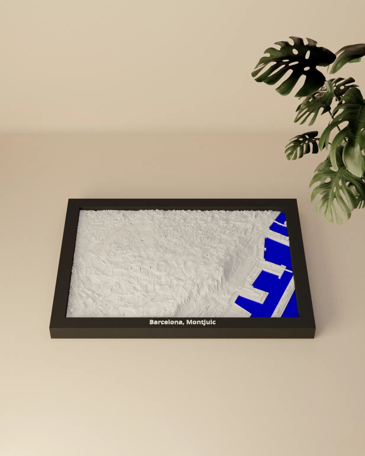 Mô hình địa hình 3D thu nhỏ tái hiện khu Barcelona, Montjuic dựa trên dữ liệu địa lý thật, tỷ lệ ~21436:1. Kèm nhiều lựa chọn frame có lỗ treo; phù hợp trưng bày, học tập hoặc làm quà tặng.