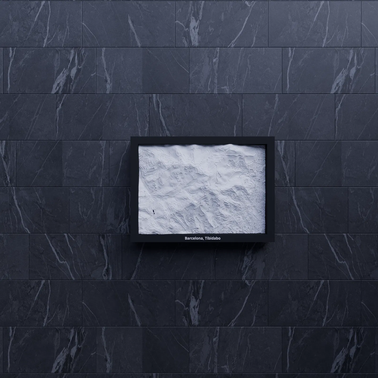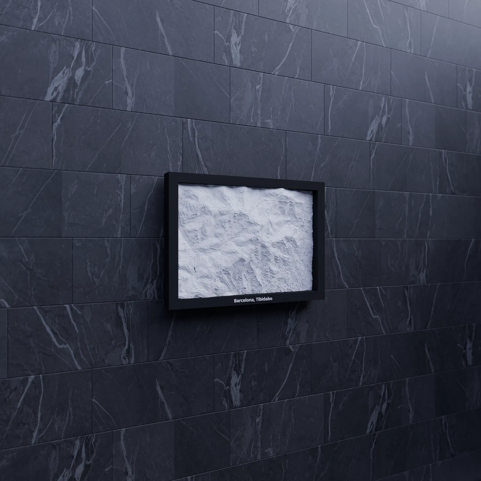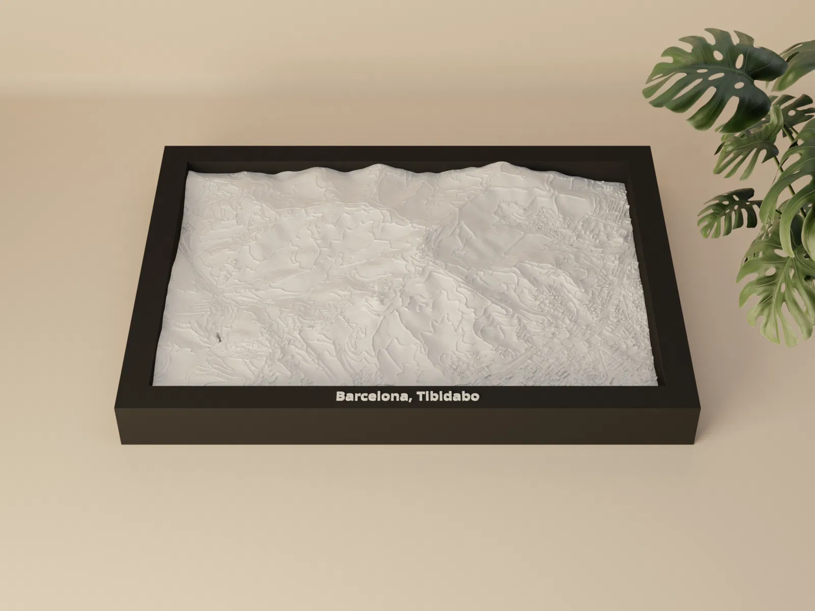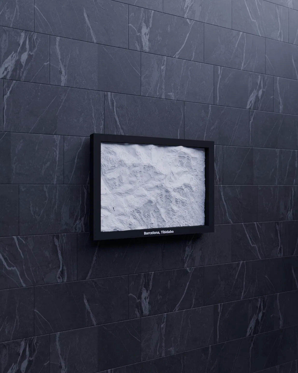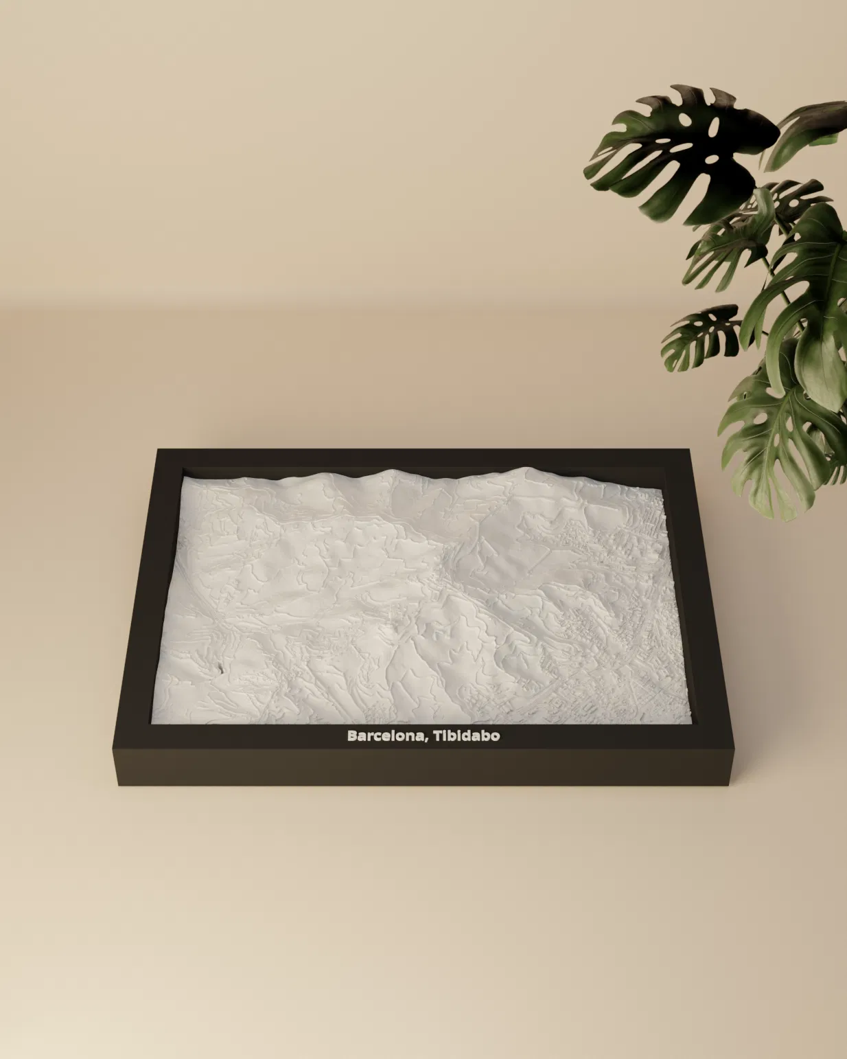 Mô hình địa hình thu nhỏ 3D tái hiện Barcelona, Tibidabo theo dữ liệu địa lý thực. Khu vực 4.291×2.995 km được thu về kích thước 170.5×119.5 mm (tỷ lệ ~25165:1), kèm nhiều lựa chọn khung treo.