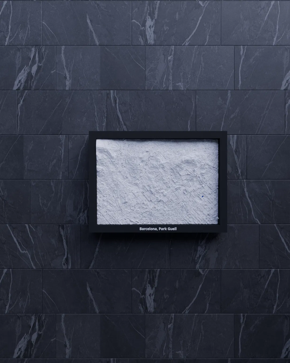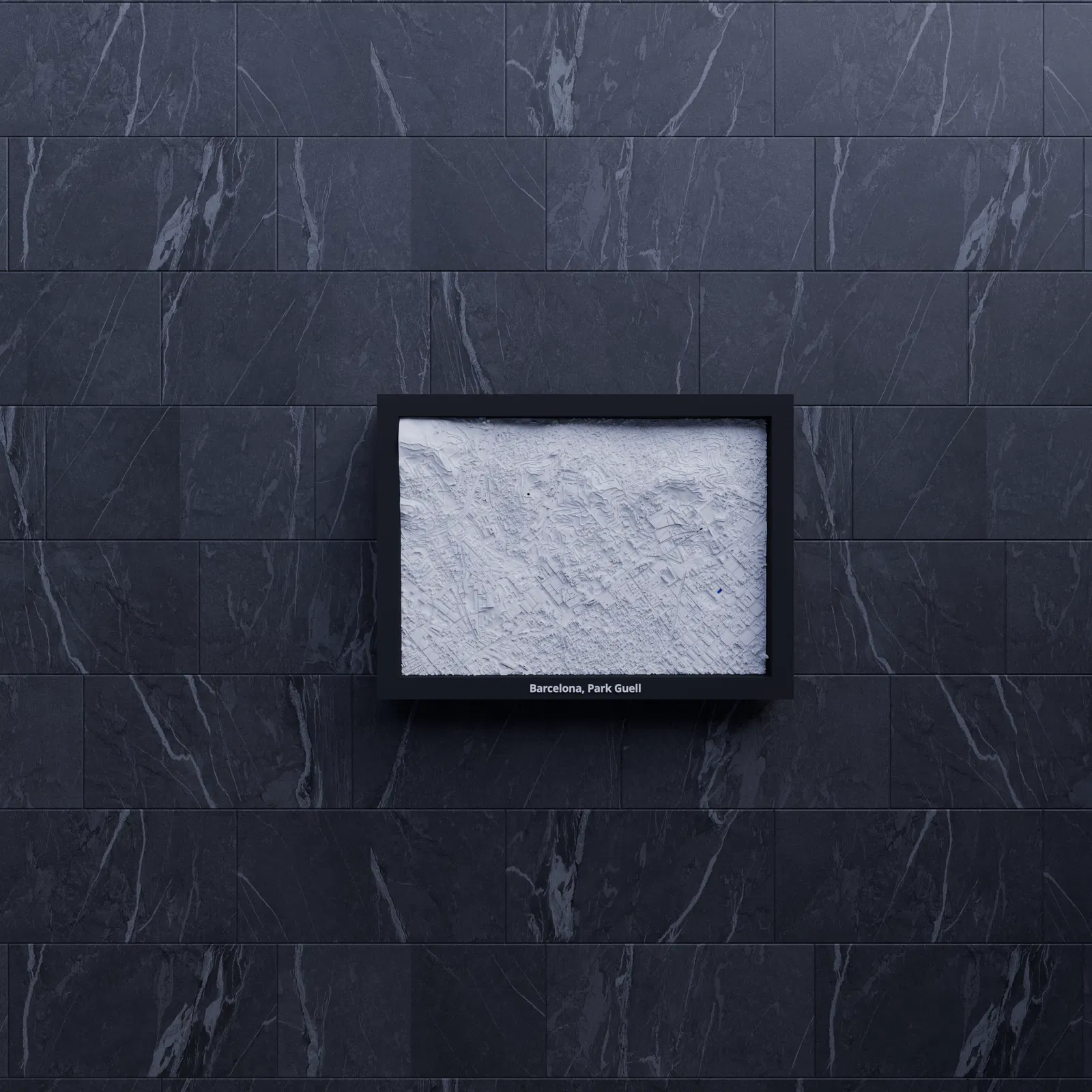Mô hình thu nhỏ địa hình Barcelona, Park Guell dựng từ dữ liệu địa lý, tỉ lệ ~21436:1. Kích thước in 170.5 x 119.5 mm, có nhiều lựa chọn frame kèm lỗ treo, phù hợp trưng bày, học tập và trang trí.