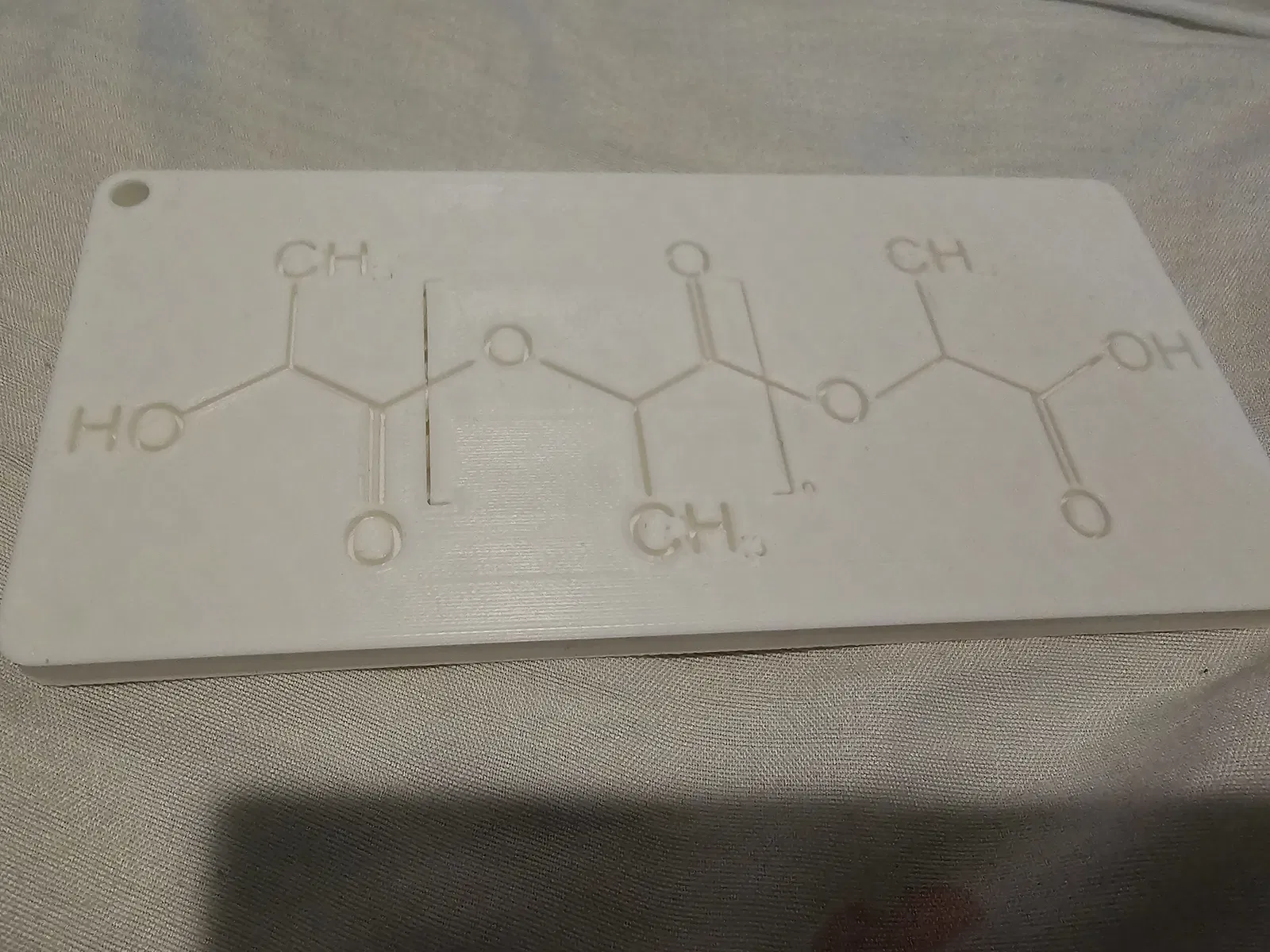 Mẫu thẻ ID dùng để test khả năng hiển thị chữ với từng loại filament, đồng thời minh hoạ công thức hoá học của nhựa PLA (PolyLactic Acid) – đúng chất cho ai mê 3D printing và chemistry.