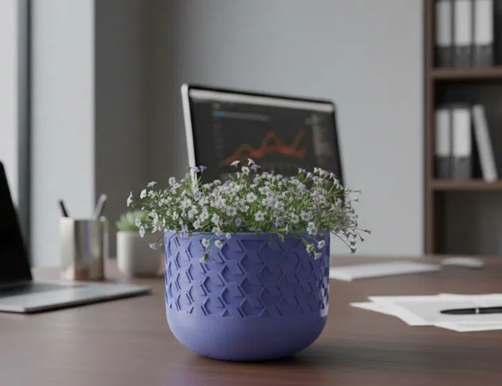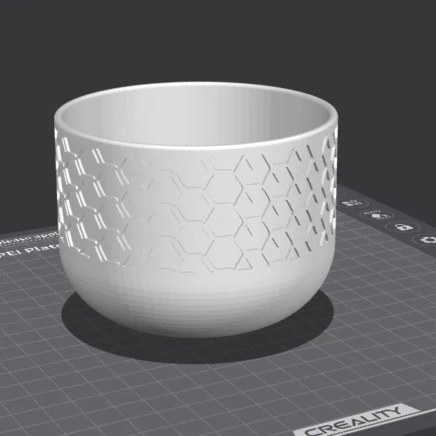 Cuenco - Macetero / Bowl - Planter là tô/chậu cây có bề mặt relief hình học. Kích thước: đường kính 10 cm, cao 7,5 cm, thành dày 3 mm, phù hợp in 3D làm chậu nhỏ hoặc đồ trang trí.