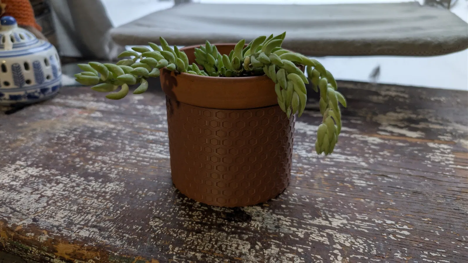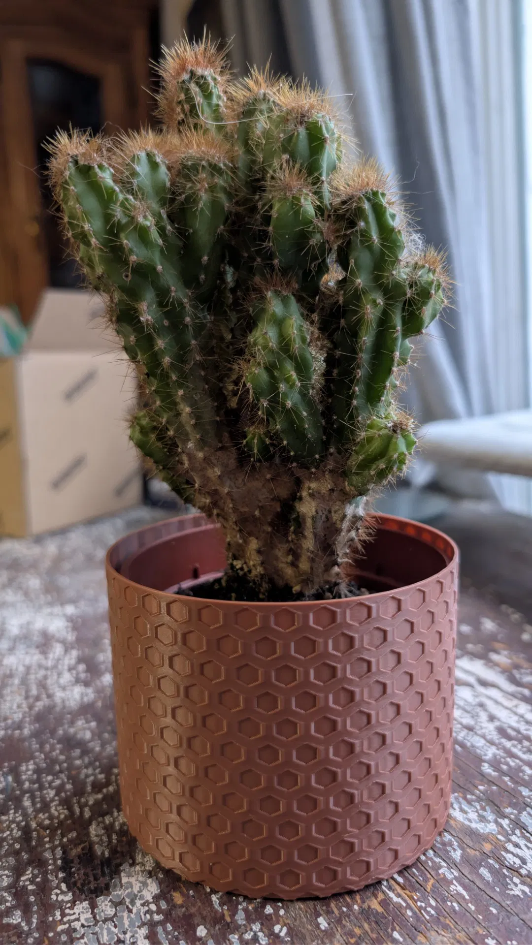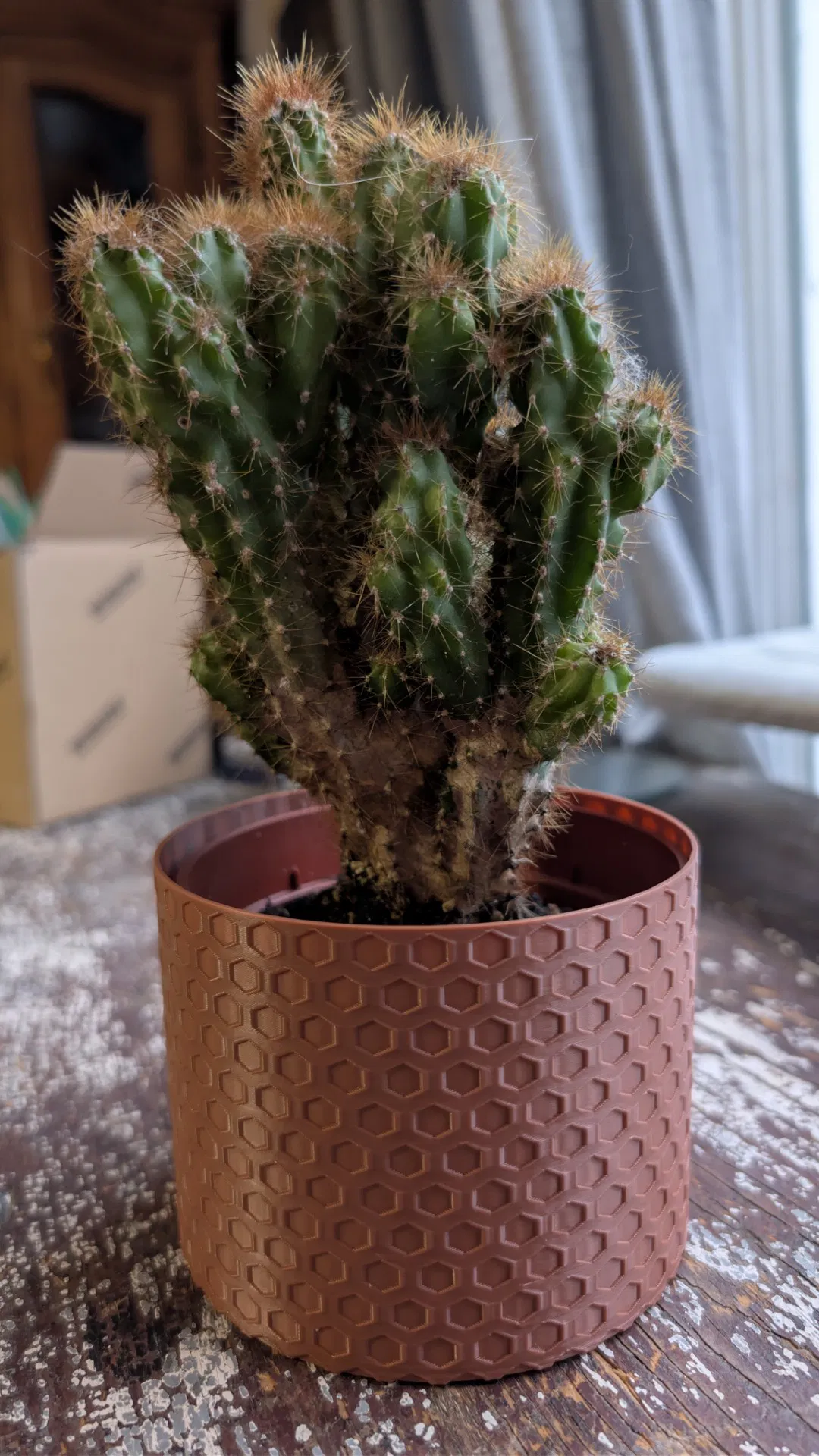 Chậu cây phong cách modern với họa tiết honeycomb (hexagon) bắt sáng đẹp, vừa chậu ươm 10cm. Có 2 chiều cao 8cm & 10cm để che chậu gọn gàng. In PLA, 0.20mm, infill 10–15%, không cần supports.