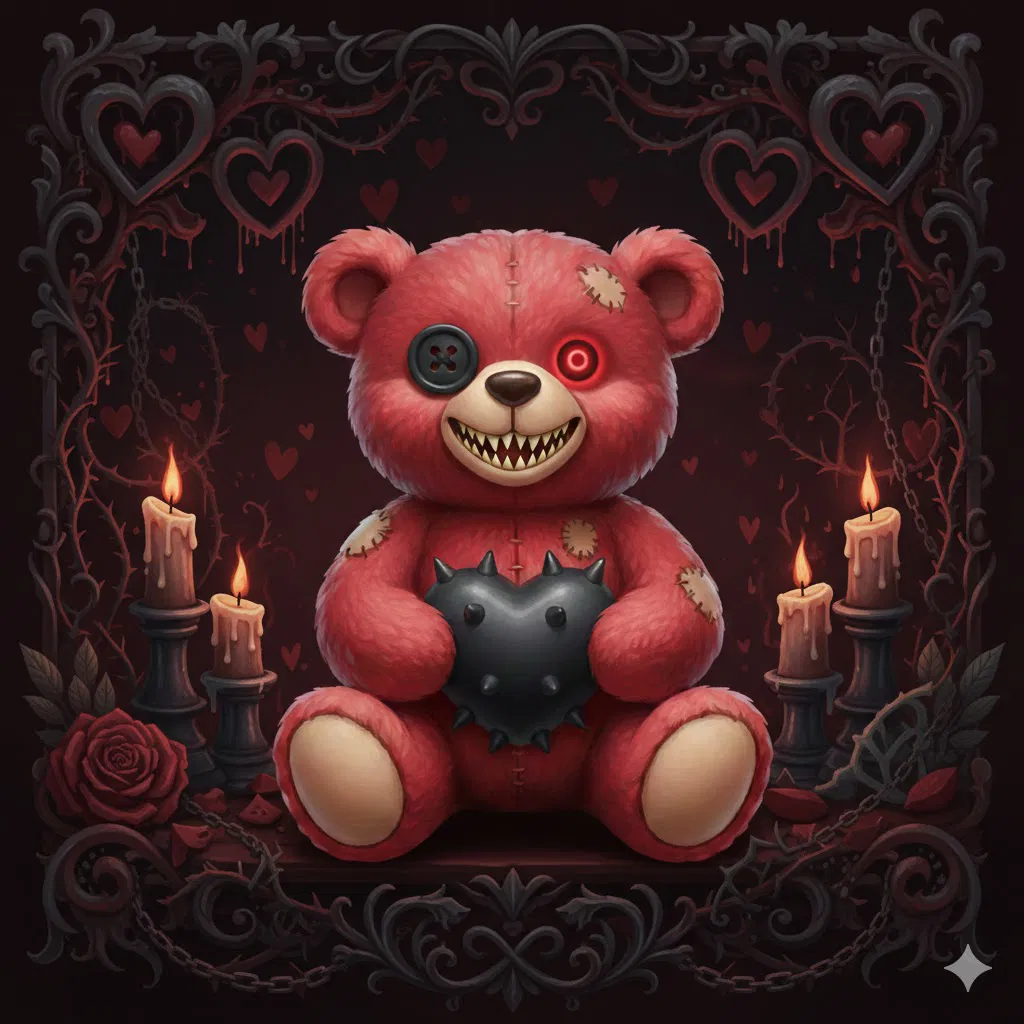 Mẫu Valentines Sinister bear – gấu bông phong cách gothic, hơi evil/sinister cho mùa Valentine. Hợp làm quà cho người gu “dark”, không thích ngày lễ, hoặc ai muốn in một teddy độc lạ.