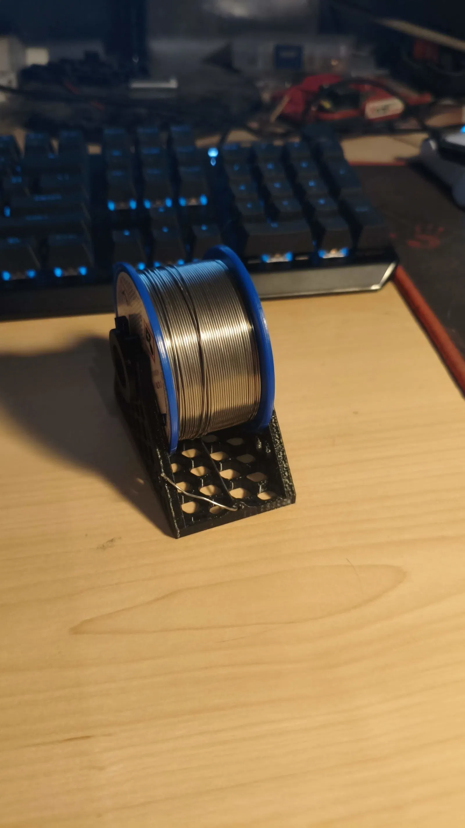 Giá đỡ cuộn thiếc hàn cynel 250g với ống cuộn tháo rời. Thiết kế đơn giản, dễ in 3D, chi phí thấp, dùng gọn gàng và rất tiện cho góc hàn hoặc bàn làm việc.