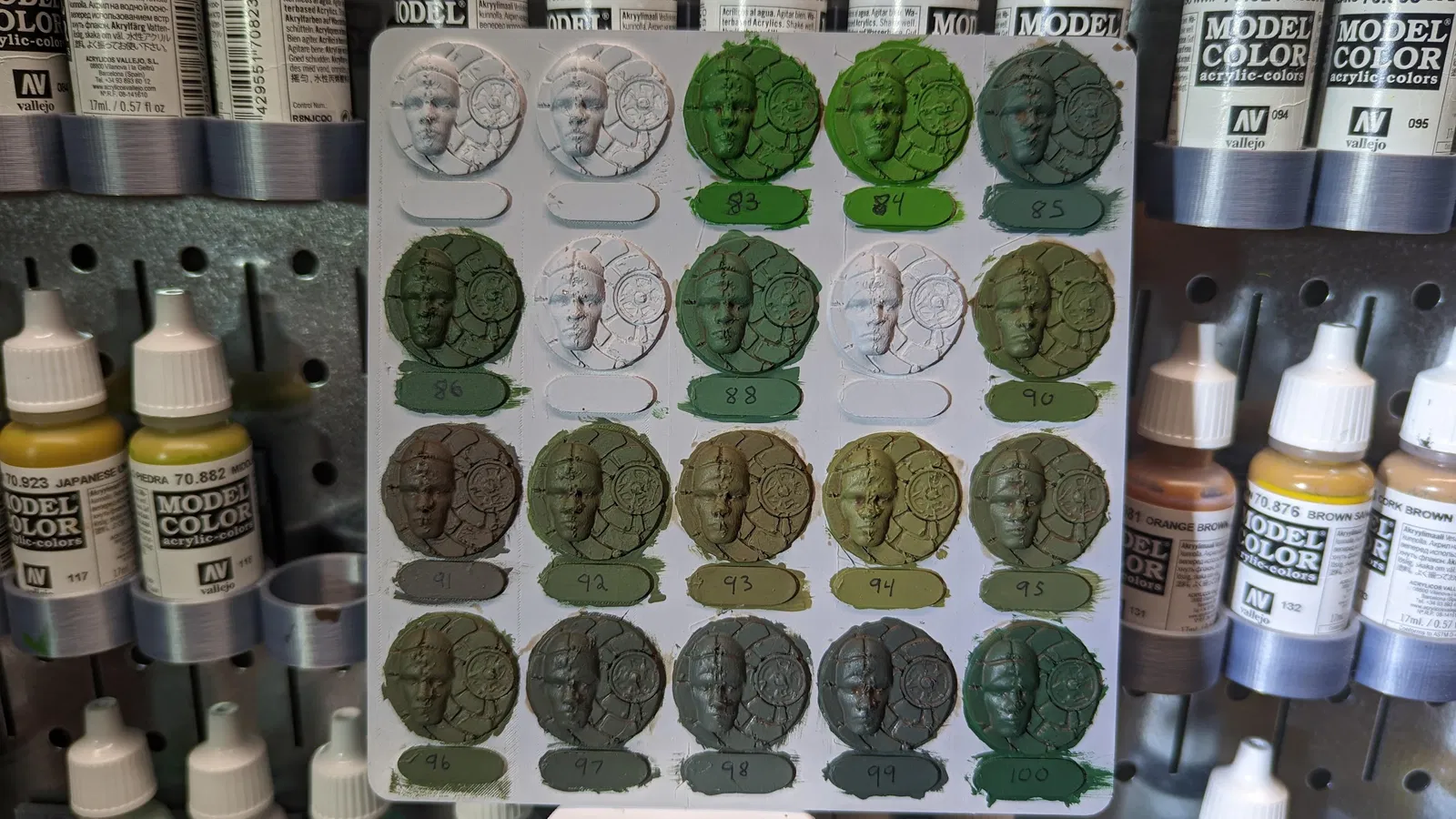 Bảng lưu swatch màu sơn để tham chiếu khi sơn mô hình miniature. Có chỗ ghi nhãn, relief được nâng nhẹ, gồm 2 bản 5x4 và 5x1. In dễ; nên dùng variable layer height và có thể bật ironing cho đẹp.