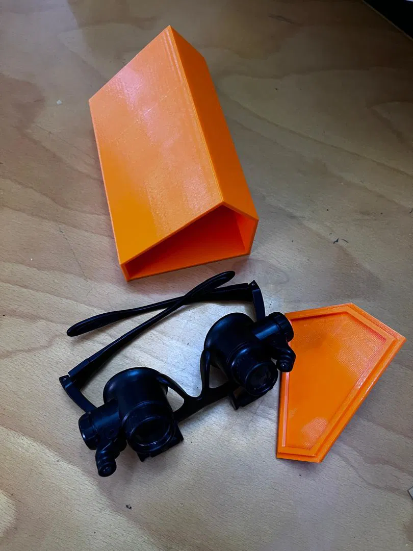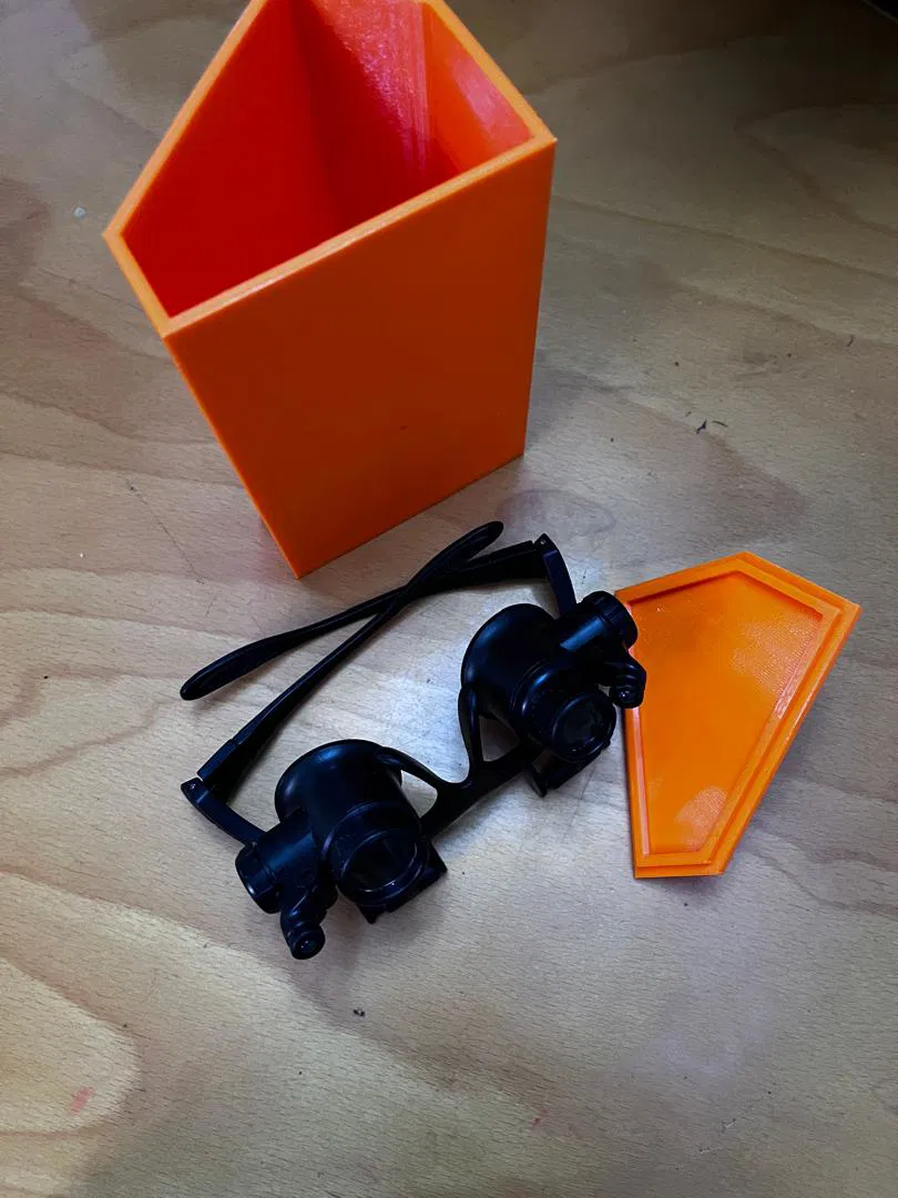 Hộp đựng in 3D giúp bảo vệ kính lúp LED/kính đeo sửa điện tử vốn rất dễ gãy khi mang theo. Thiết kế vừa khít, vỏ cứng với honeycomb infill, nắp friction-fit, không cần support; tab kéo nắp dán bằng super glue.