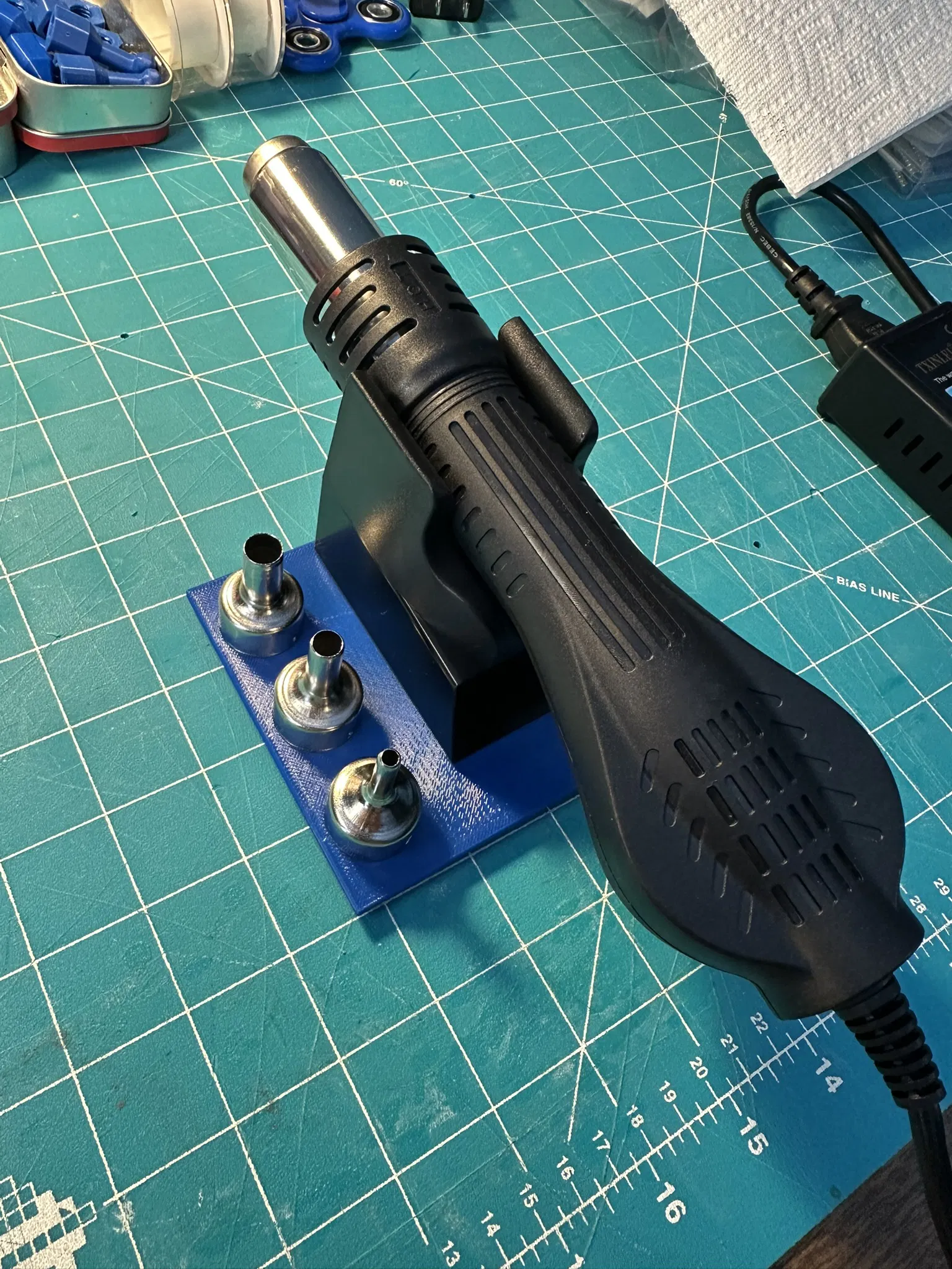 Đế in 3D vững chắc cho hot air soldering iron/handpiece, gài stand nhanh và có chỗ để các nozzle ngay bên hông. Mặt dưới có hốc cho rubber feet. Thiết kế TinkerCAD, in PETG, không cần supports.