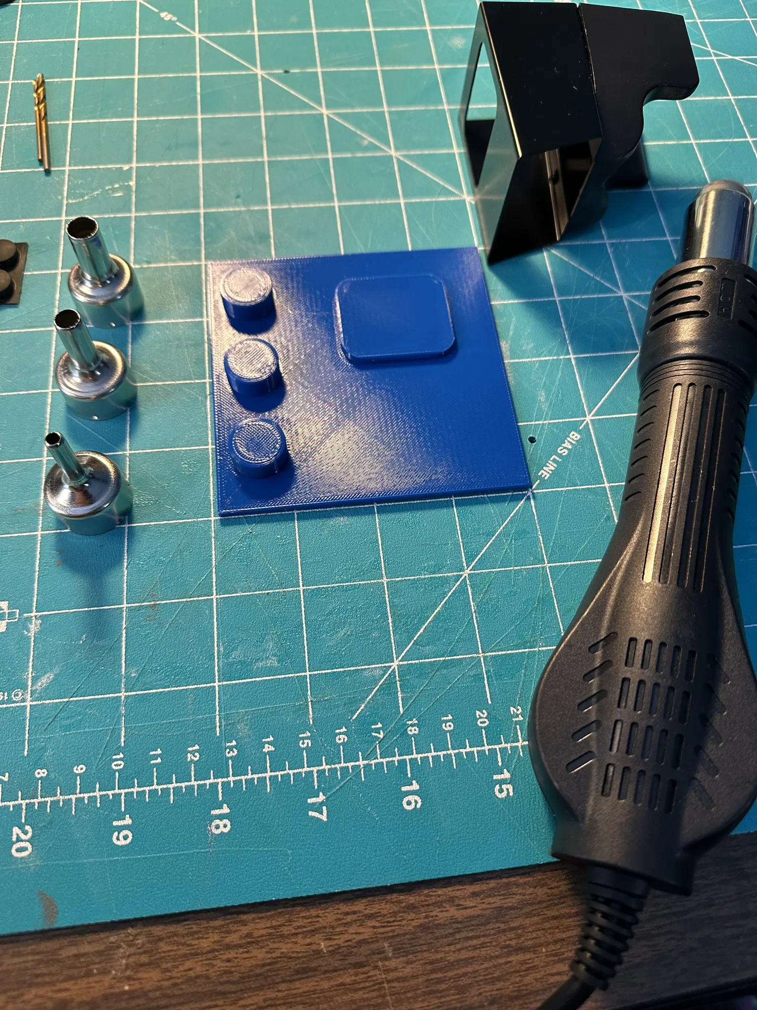 Mình làm một cái đế vững hơn cho khẩu hot air soldering gun mới mua trên Amazon gần đây. Cái stand đi kèm không được chắc lắm và cũng không có chỗ để cất các nozzle. Stand gài vào đế rất dễ, còn các nozzle thì để gọn gàng ngay bên hông. Phía dưới có các hốc để gắn vừa các chân cao su (rubber feet) đi kèm theo máy.