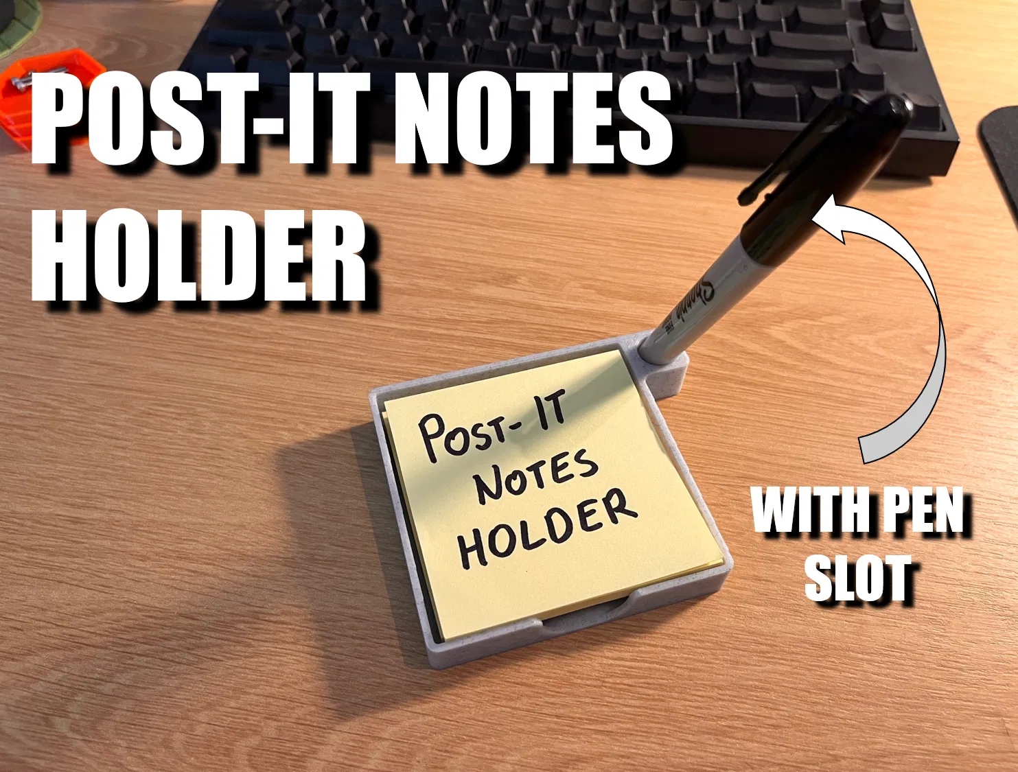 Đây là một kệ đựng giấy ghi chú Post-It rất đơn giản (in nhanh), thiết kế cho giấy sticky notes cỡ 3" x 3", kèm thêm một ngăn để cắm bút hoặc Sharpie. Để trên bàn làm việc, bàn thao tác, trong bếp hay bất kỳ chỗ nào cũng được.