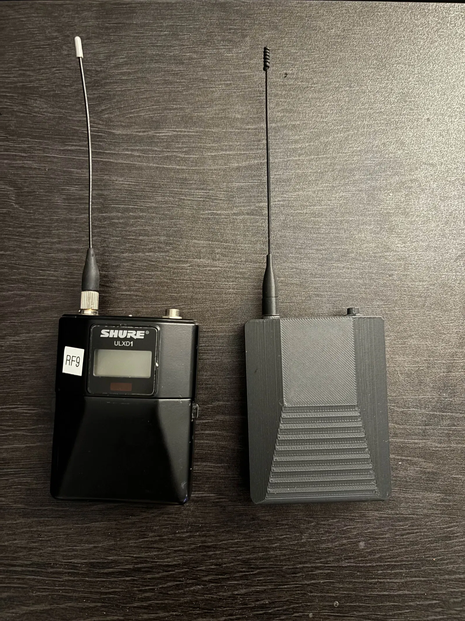 Mẫu 3D cơ bản của bộ phát bodypack Shure ULXD 1. File Body và Antenna được tách riêng để dùng khi khổ in của máy không đủ lớn để in nguyên khối toàn bộ model. Phần anten và thân bodypack có ren tương ứng nên có thể vặn ráp lại với nhau giống như hàng thật ngoài đời.