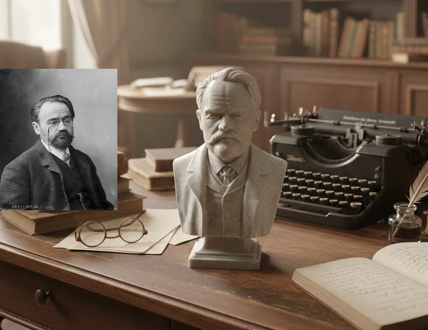 Bức tượng bán thân này khắc họa Émile Zola, nhà văn lớn của thế kỷ 19 và là gương mặt hàng đầu của chủ nghĩa tự nhiên trong văn học. Nổi tiếng nhất với Les Rougon-Macquart, Zola cũng giữ vai trò then chốt trong lịch sử Pháp nhờ sự dấn thân chính trị, đặc biệt trong vụ án Dreyfus với văn bản nổi tiếng J’accuse…!.