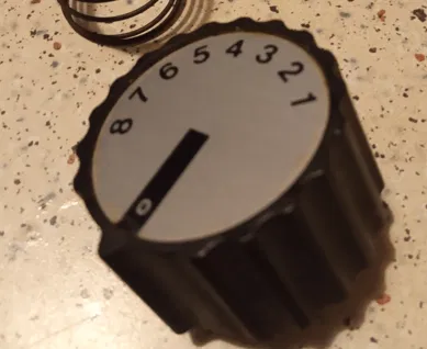 Núm vặn điều khiển lò nướng gas (bên phải) cho bếp Mora 218. Gợi ý in: PETG lớp 0.2mm, 5 perimeters. Phù hợp để thay thế núm bị gãy/mất trên cụm điều khiển lò.