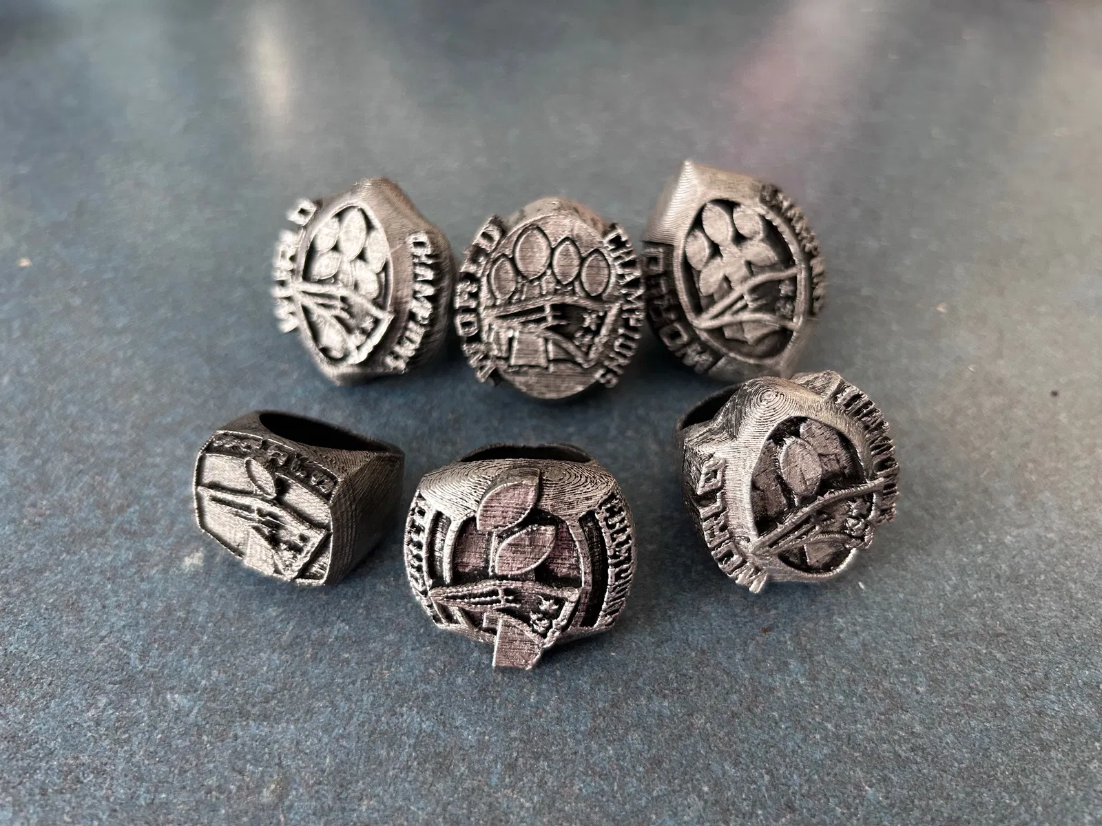 Bộ gồm 6 mẫu nhẫn mô phỏng Super Bowl rings mà New England Patriots đã giành được trong vài năm qua. Lỗ nhẫn đường kính 0.875 inch, có thể scale để vừa tay khi in 3D.